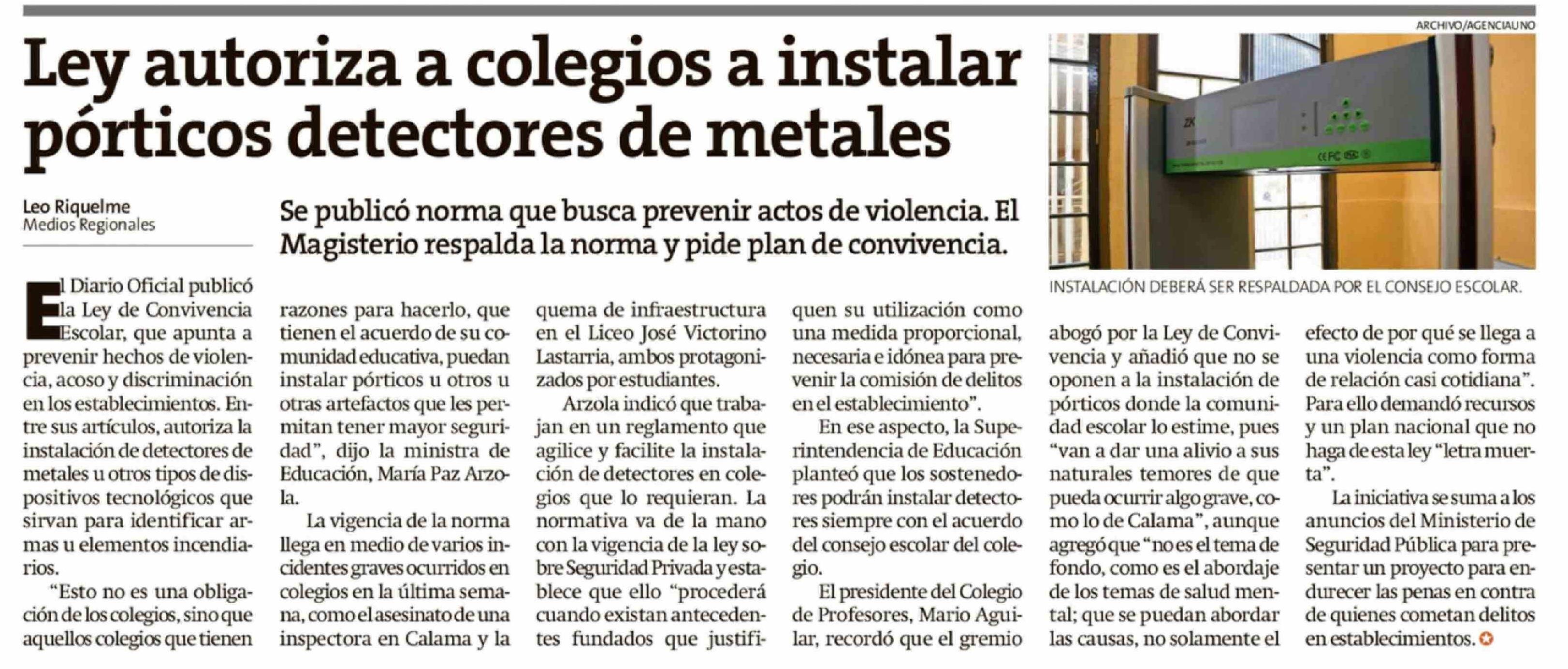 | Título: | Ley autoriza a colegios a instalar pórticos detectores de metales |