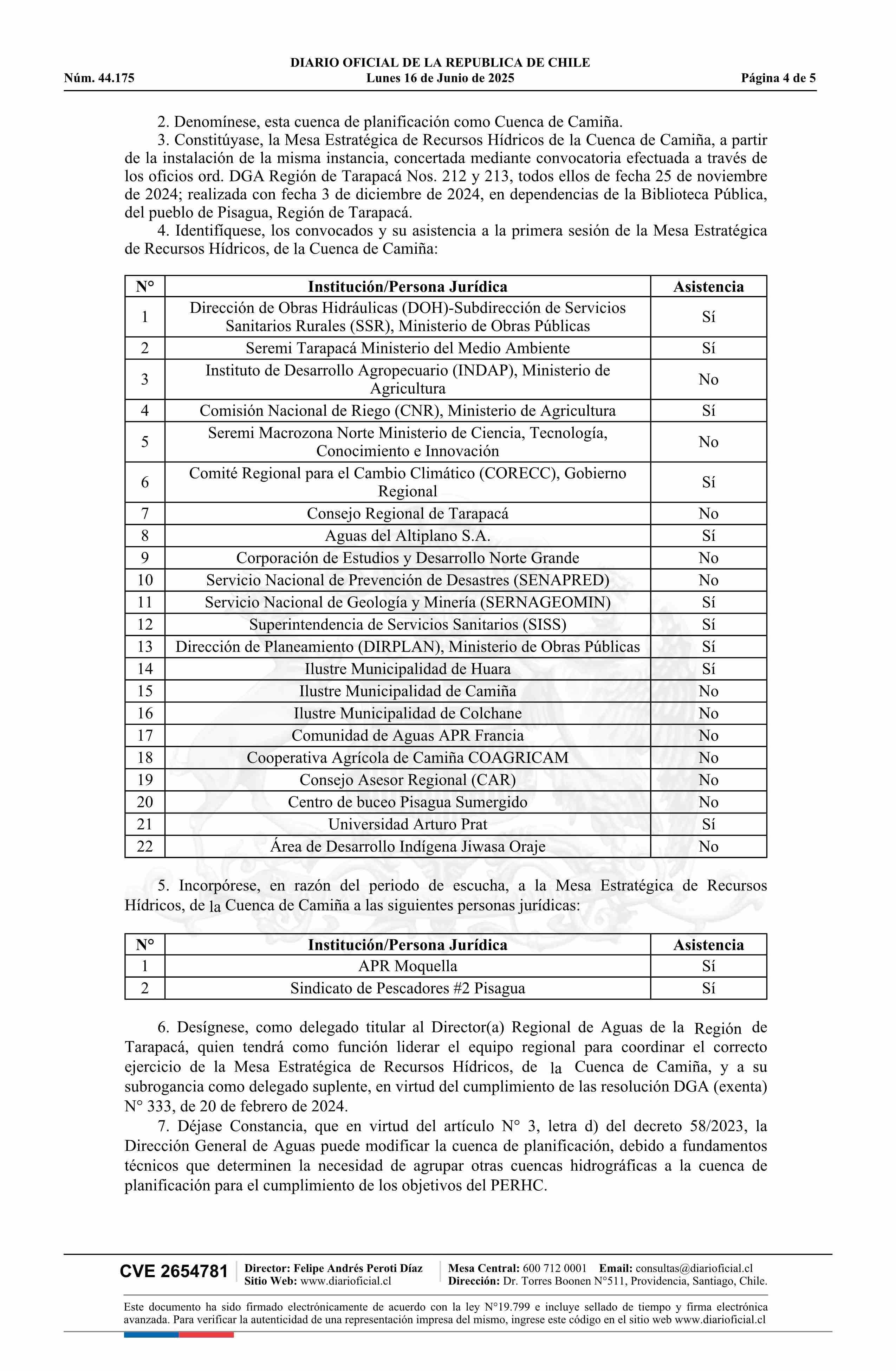| Título: | Resolución exenta número 1.849, de 2025.- Delimita y denomina cuenca de planificación para el desarrollo del Plan Estratégico de Recursos Hídricos en la Cuenca de Camiña; constituye mesa estratégica de recursos hídricos e identifica convocados y asistencia a primera sesión; y designa Delegado(a) de |