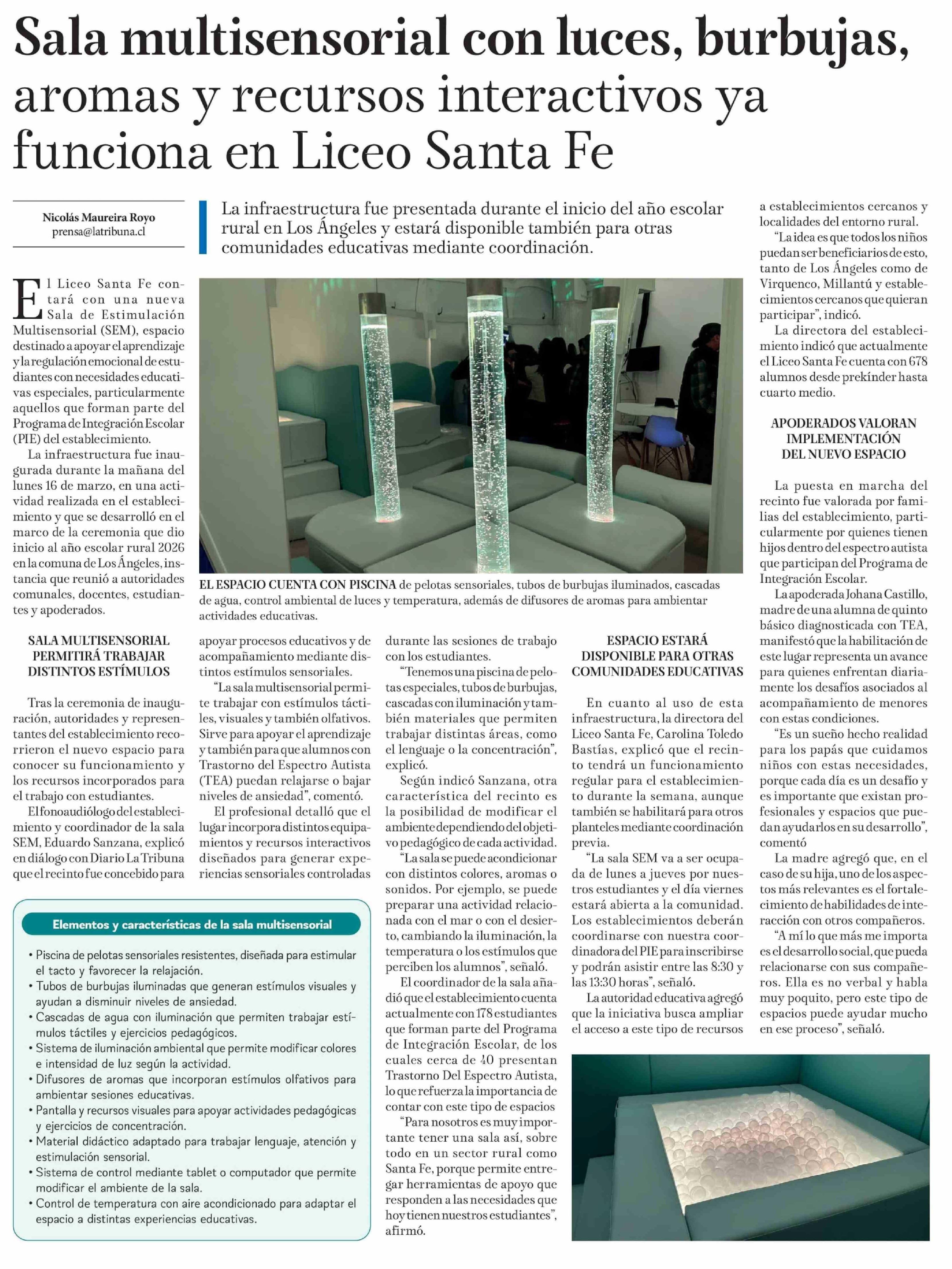 | Título: | Sala multisensorial con luces, burbujas, aromas y recursos interactivos ya funciona en Liceo Santa Fe |