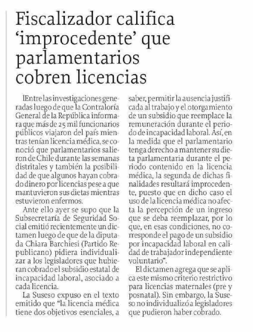 | Título: | Fiscalizador califica “improcedente” que parlamentarios cobren licencias |