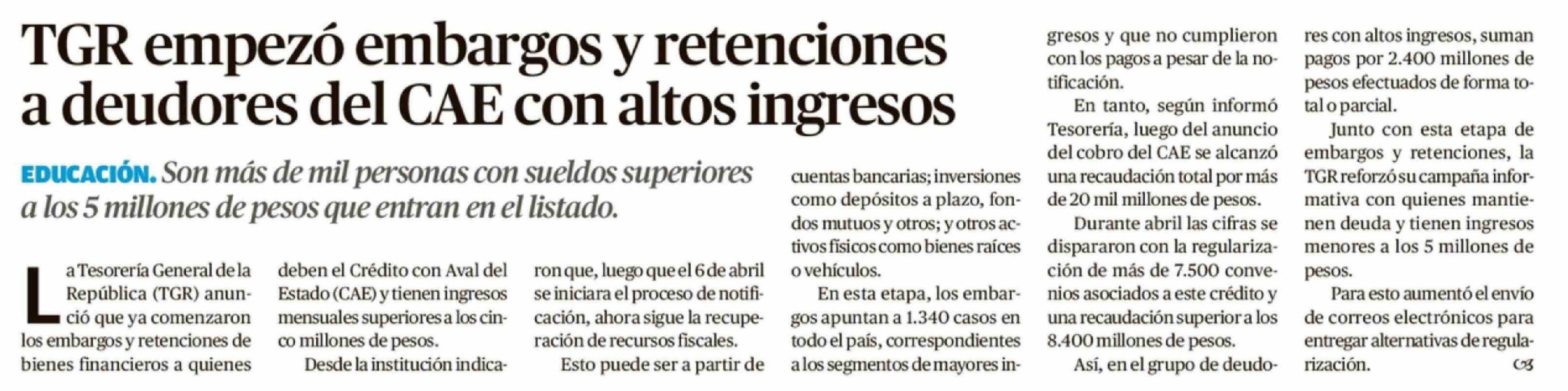 Título: TGR empezó embargos y retenciones a deudores del CAE con altos ingresos