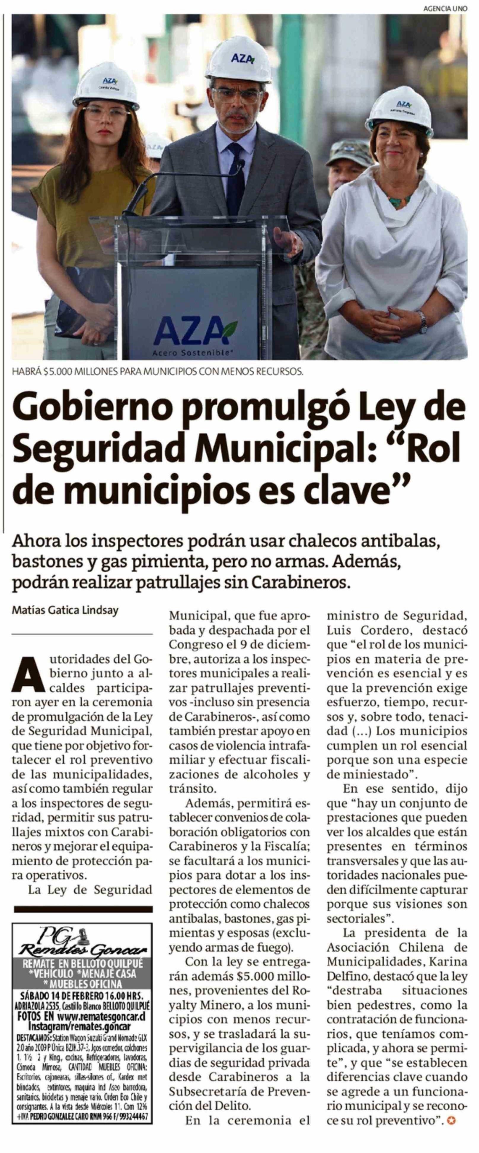 Gobierno promulgó Ley de Seguridad Municipal: "Rol de municipios es clave" 07-02-2026 La Estrella de Valparaíso |
