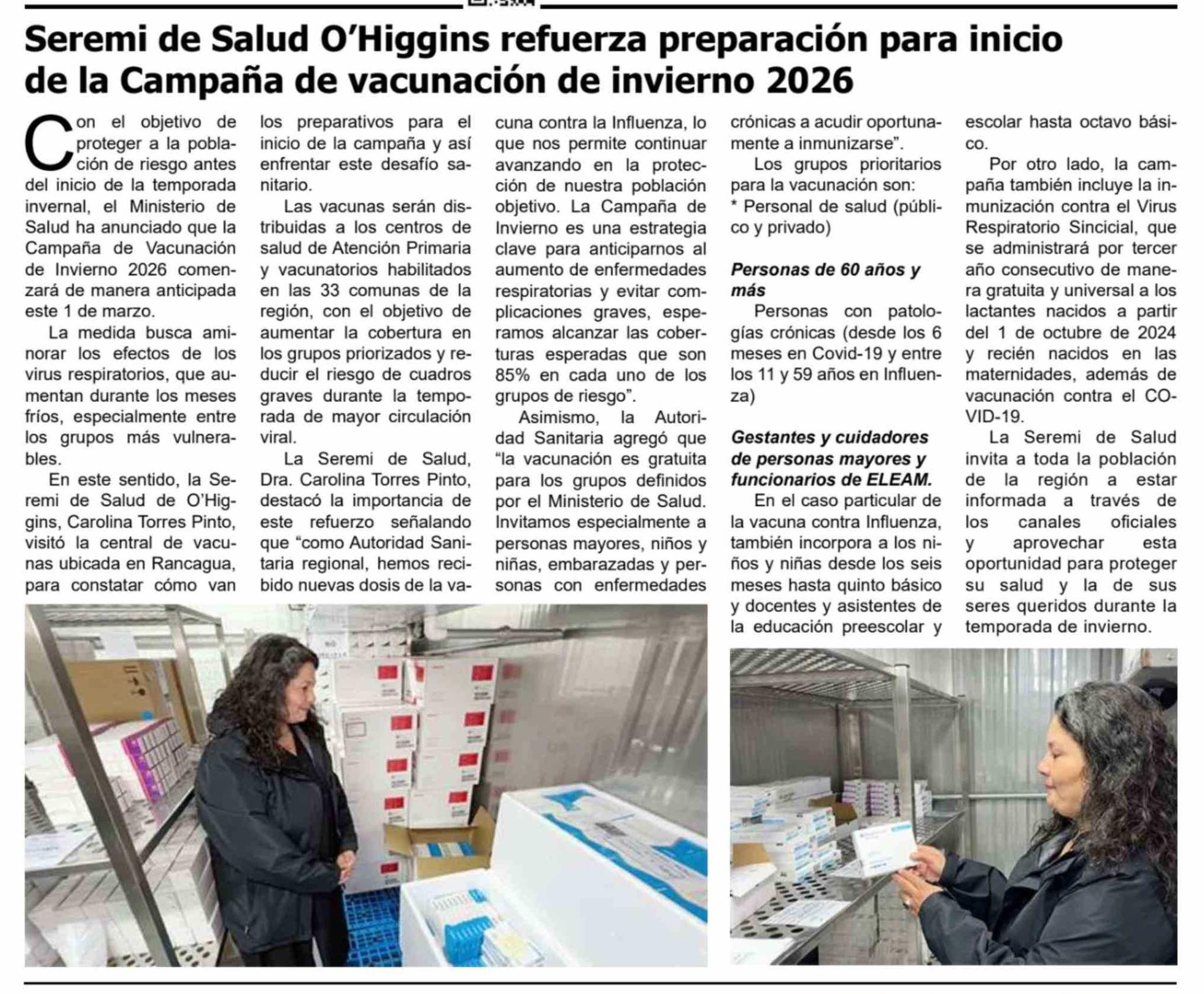 Seremi de Salud O'Higgins refuerza preparación para inicio de la Campaña de vacunación de invierno 2026 28-02-2026 Diario El Cóndor |