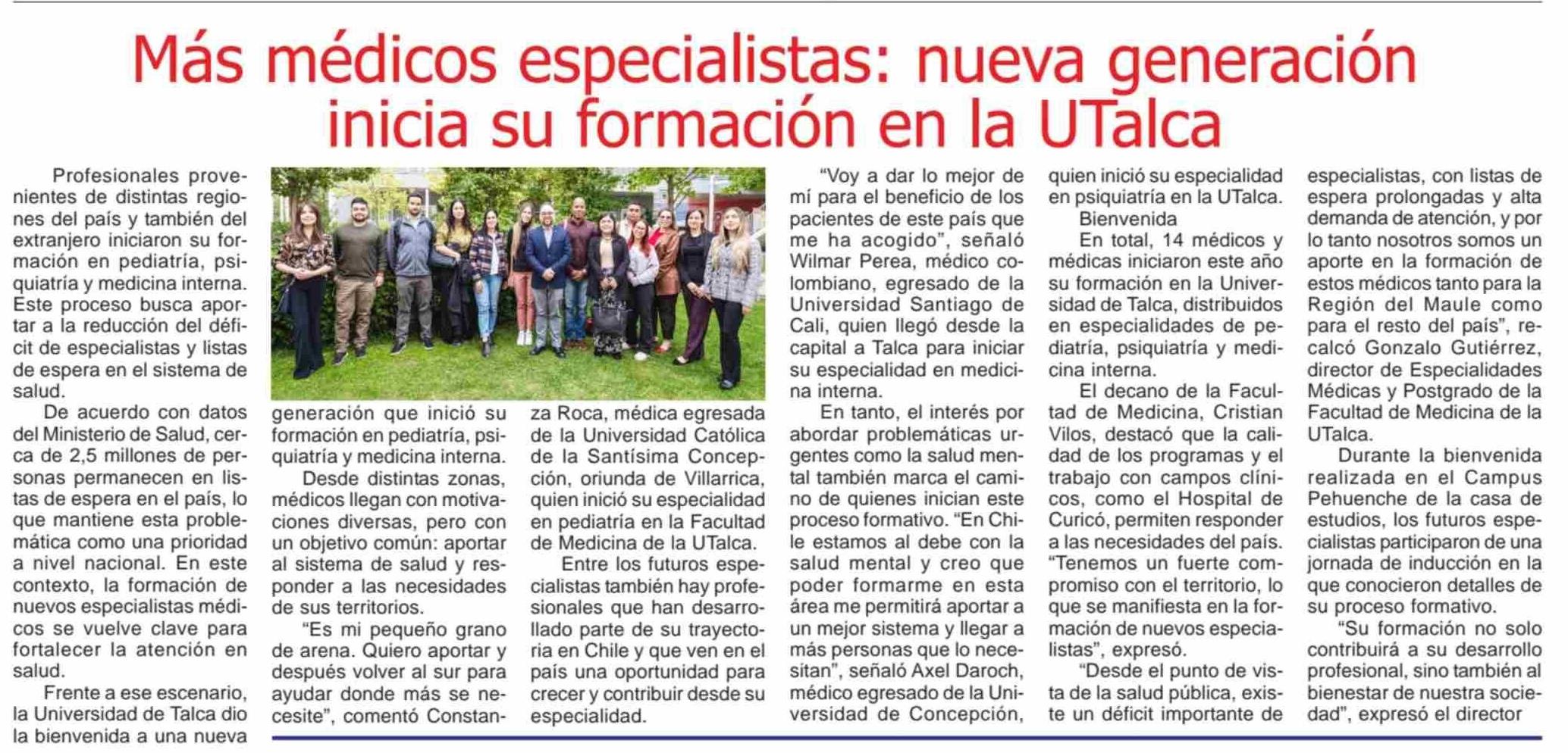 Más médicos especialistas: nueva generación inicia su formación en la UTalca 11-04-2026 Maule Hoy |