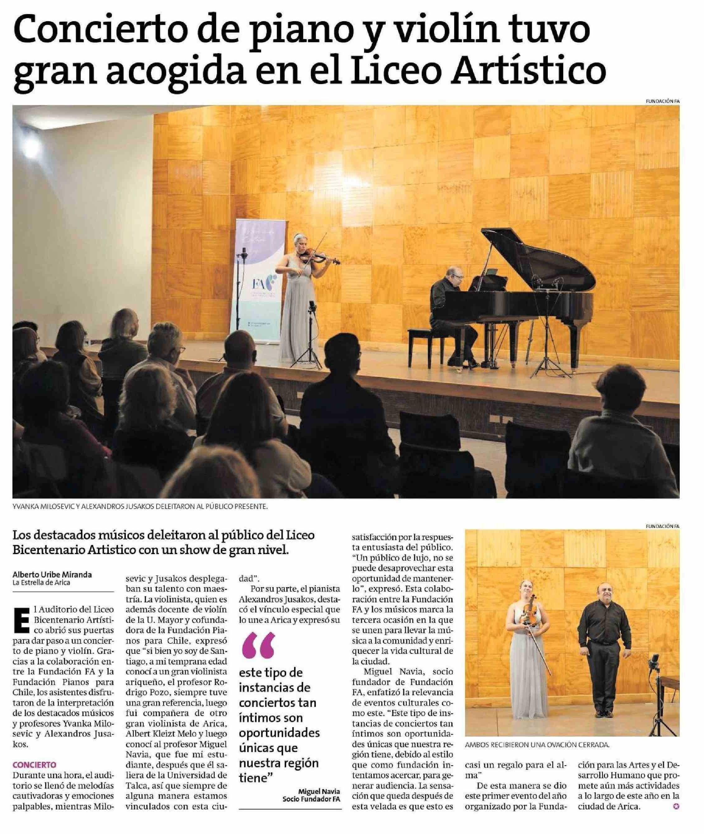 Concierto de piano y violín tuvo gran acogida en el Liceo Artístico 02-05-2024 La Estrella de Arica |