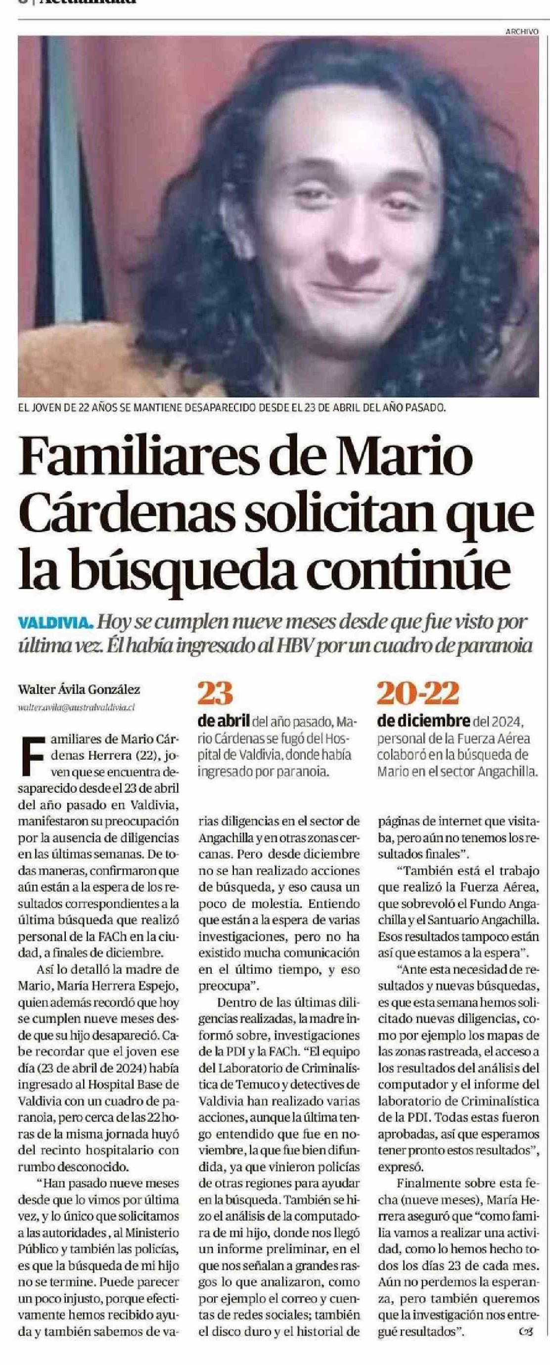 Familiares de Mario Cárdenas solicitan que la búsqueda continúe 23-01-2025 Diario Austral Región de Los Ríos |
