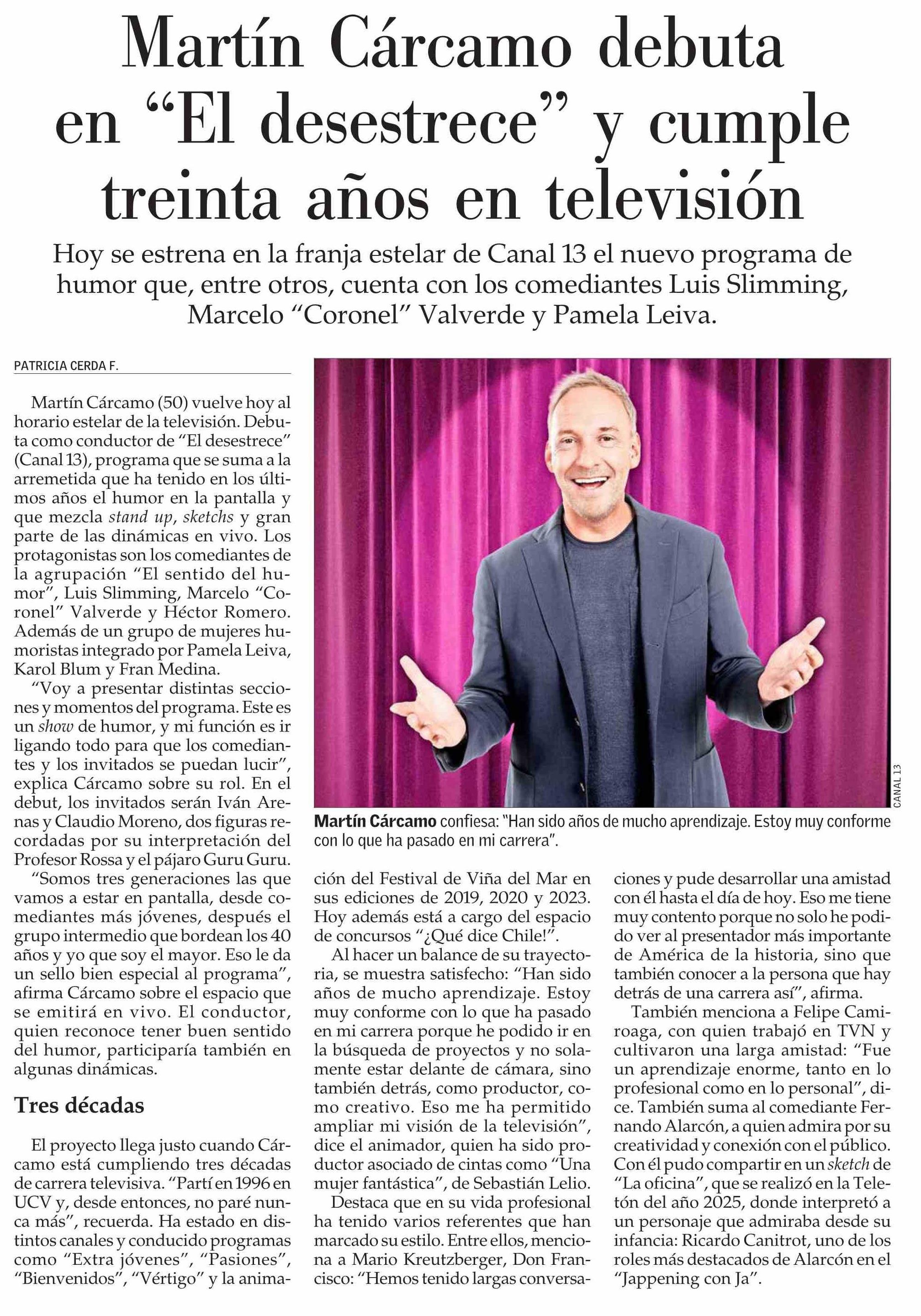 Martín Cárcamo debuta en “El desestrece” y cumple treinta años en televisión 05-04-2026 El Mercurio |