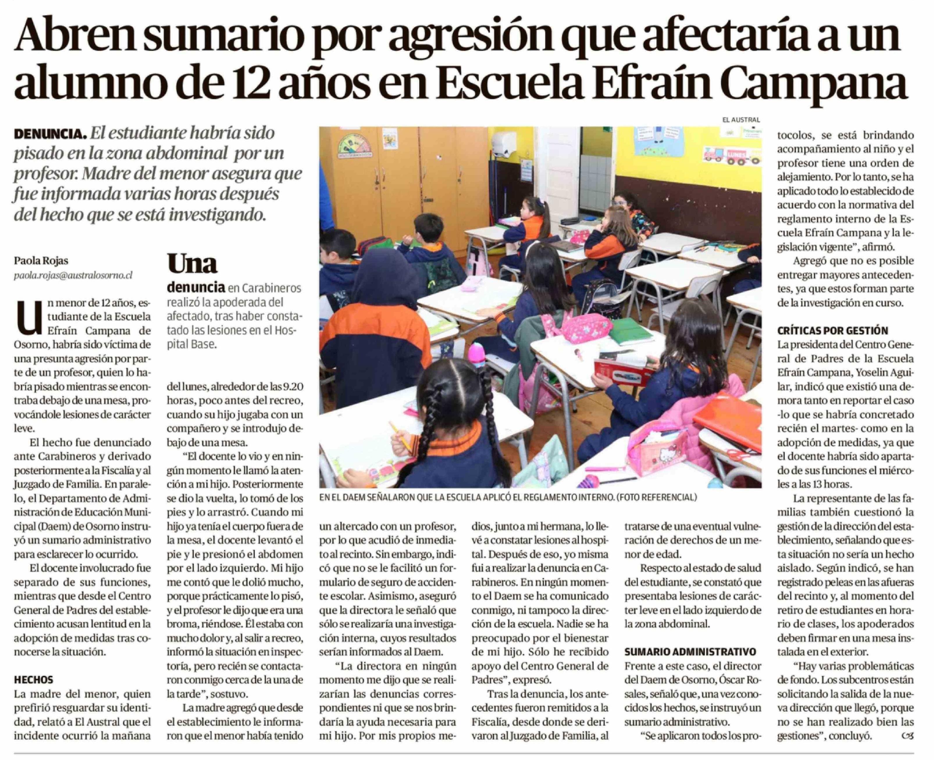 Abren sumario por agresión que afectaría a un alumno de 12 años en Escuela Efraín Campana 03-04-2026 El Austral de Osorno |