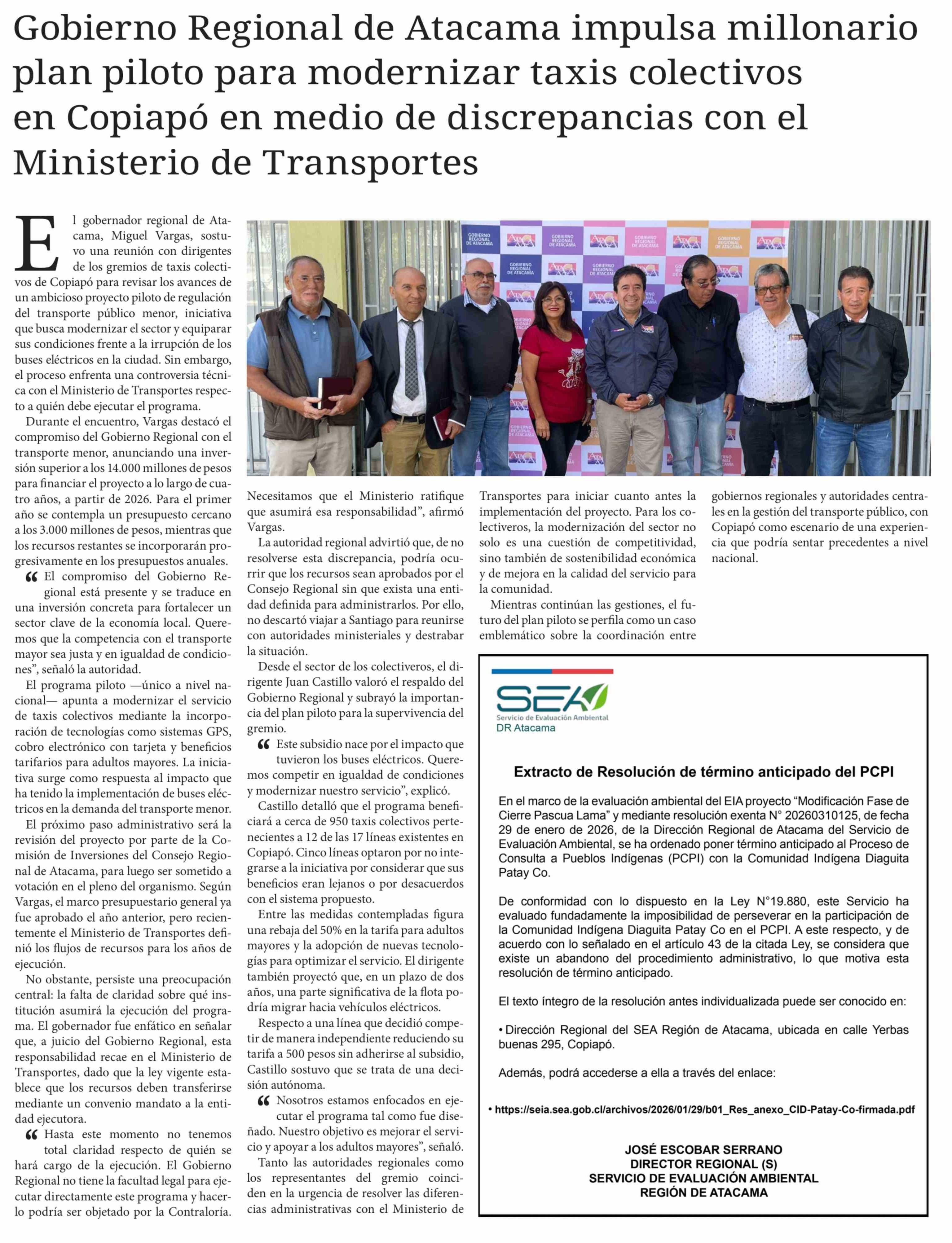 Gobierno Regional de Atacama impulsa millonario plan piloto para modernizar taxis colectivos en Copiapó en medio de discrepancias con el Ministerio de Transportes 10-02-2026 Diario Chañarcillo |