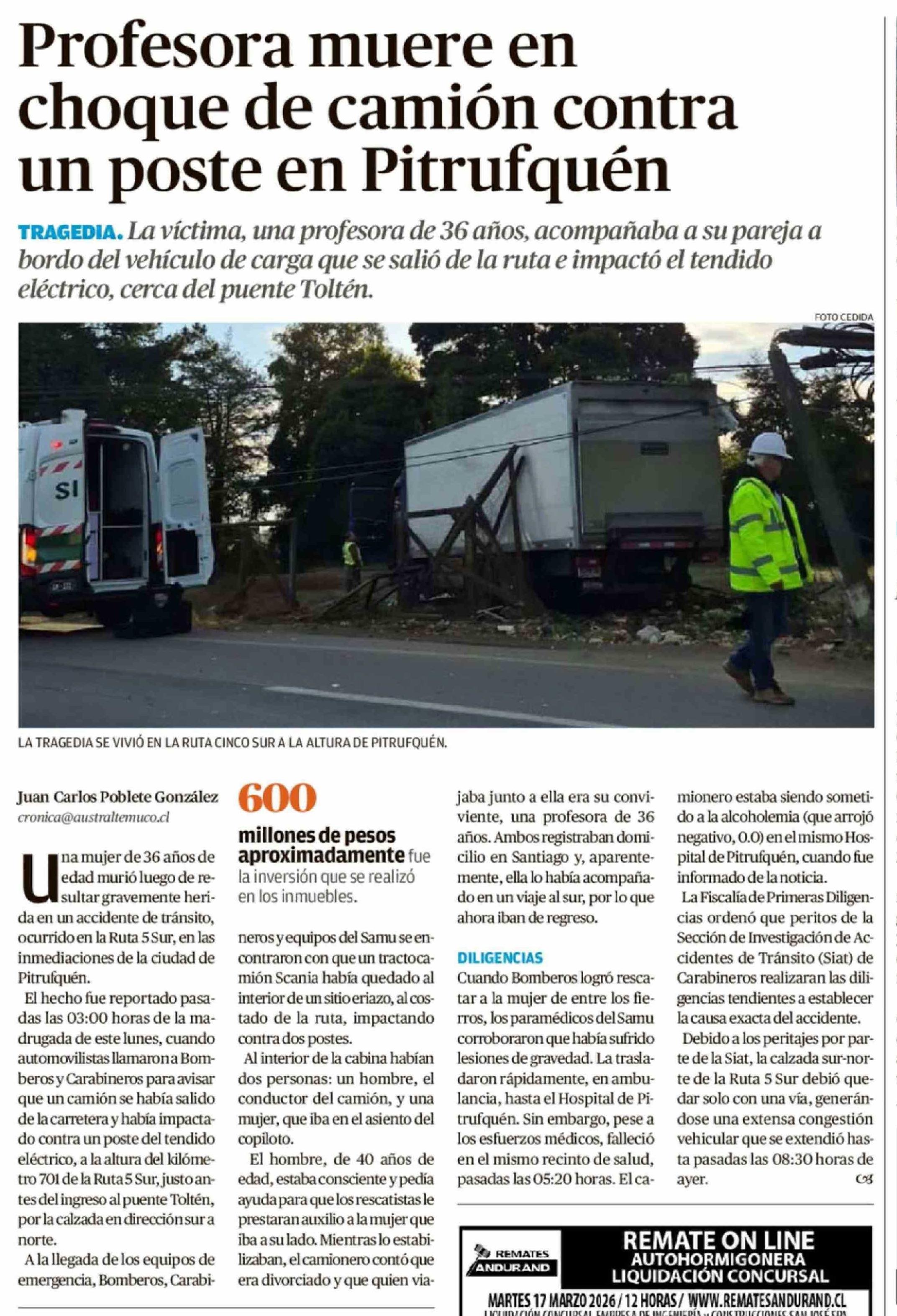 Título: Profesora muere en choque de camión contra un poste en Pitrufquén