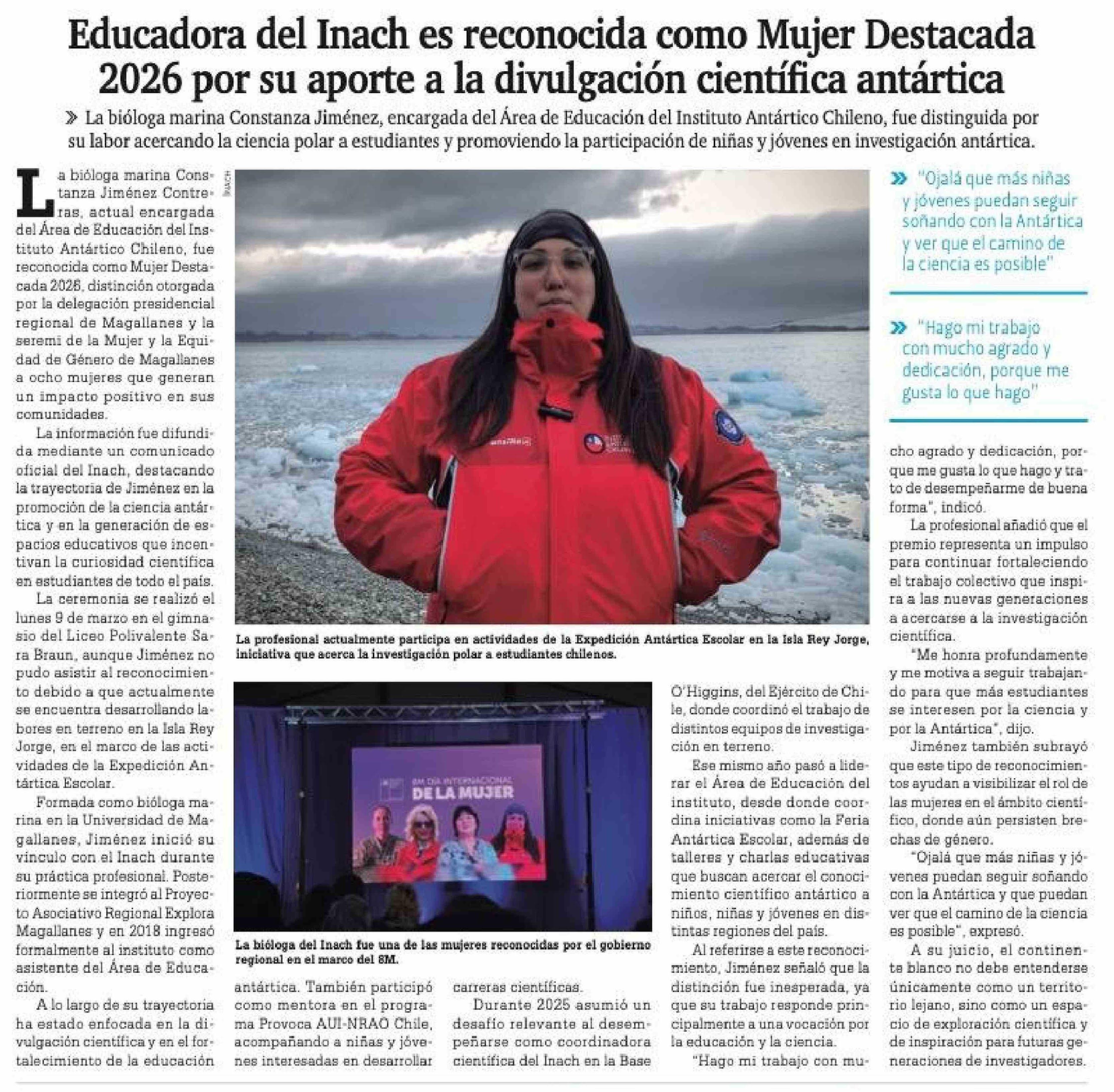 Título: Educadora del Inach es reconocida como Mujer Destacada 2026 por su aporte a la divulgación científica antártica