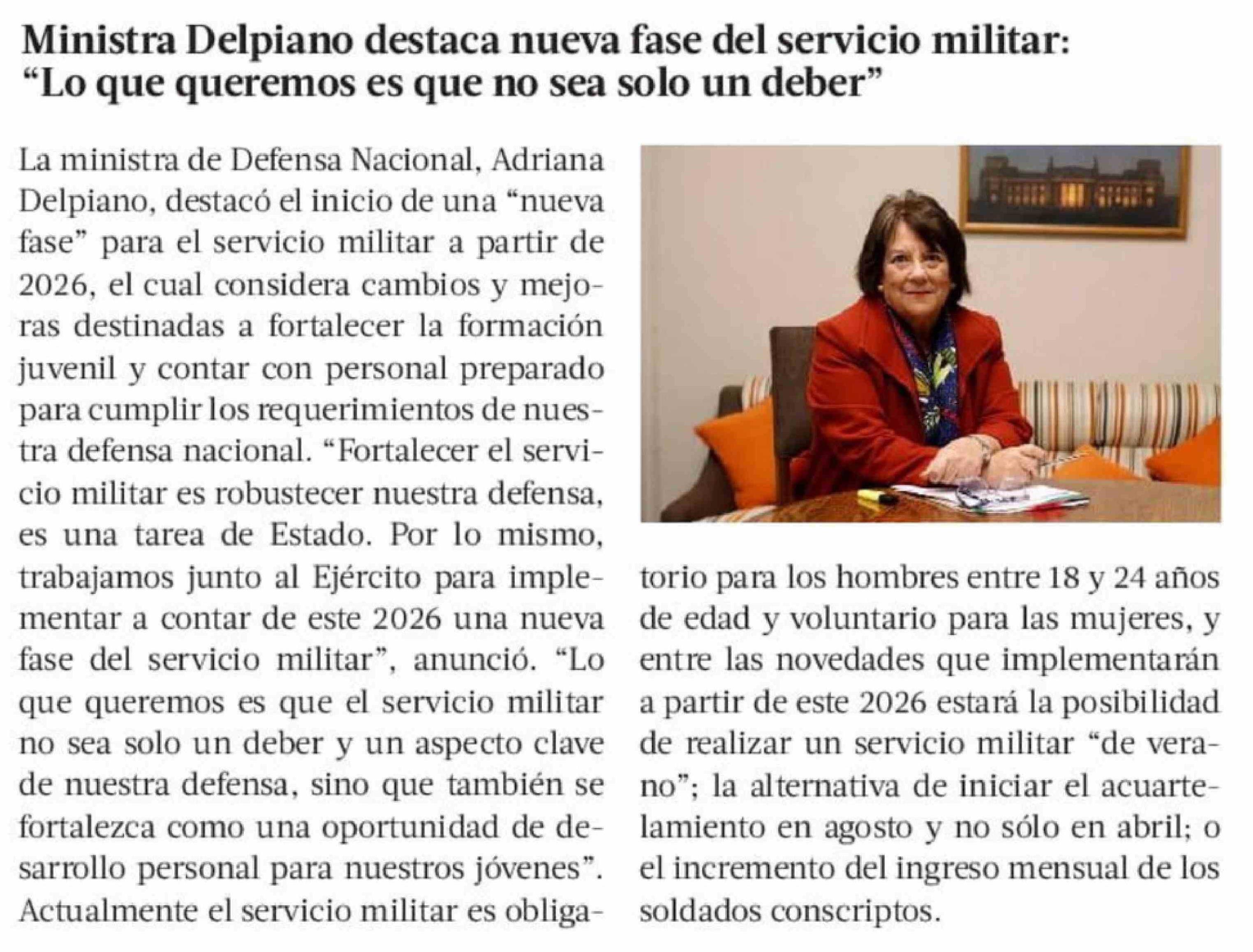 | Título: | Ministra Delpiano destaca nueva fase del servicio militar: "Lo que queremos es que no sea solo un deber" |