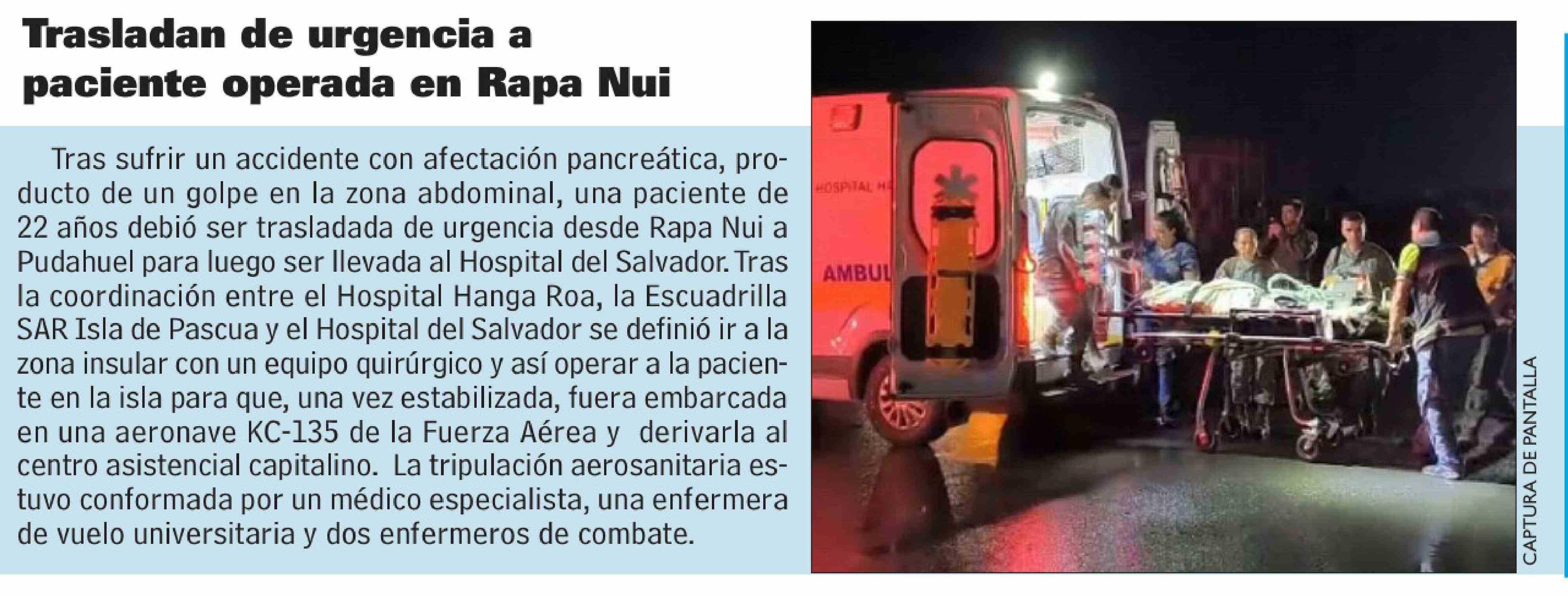 | Título: | Trasladan de urgencia a paciente operada en Rapa Nui |