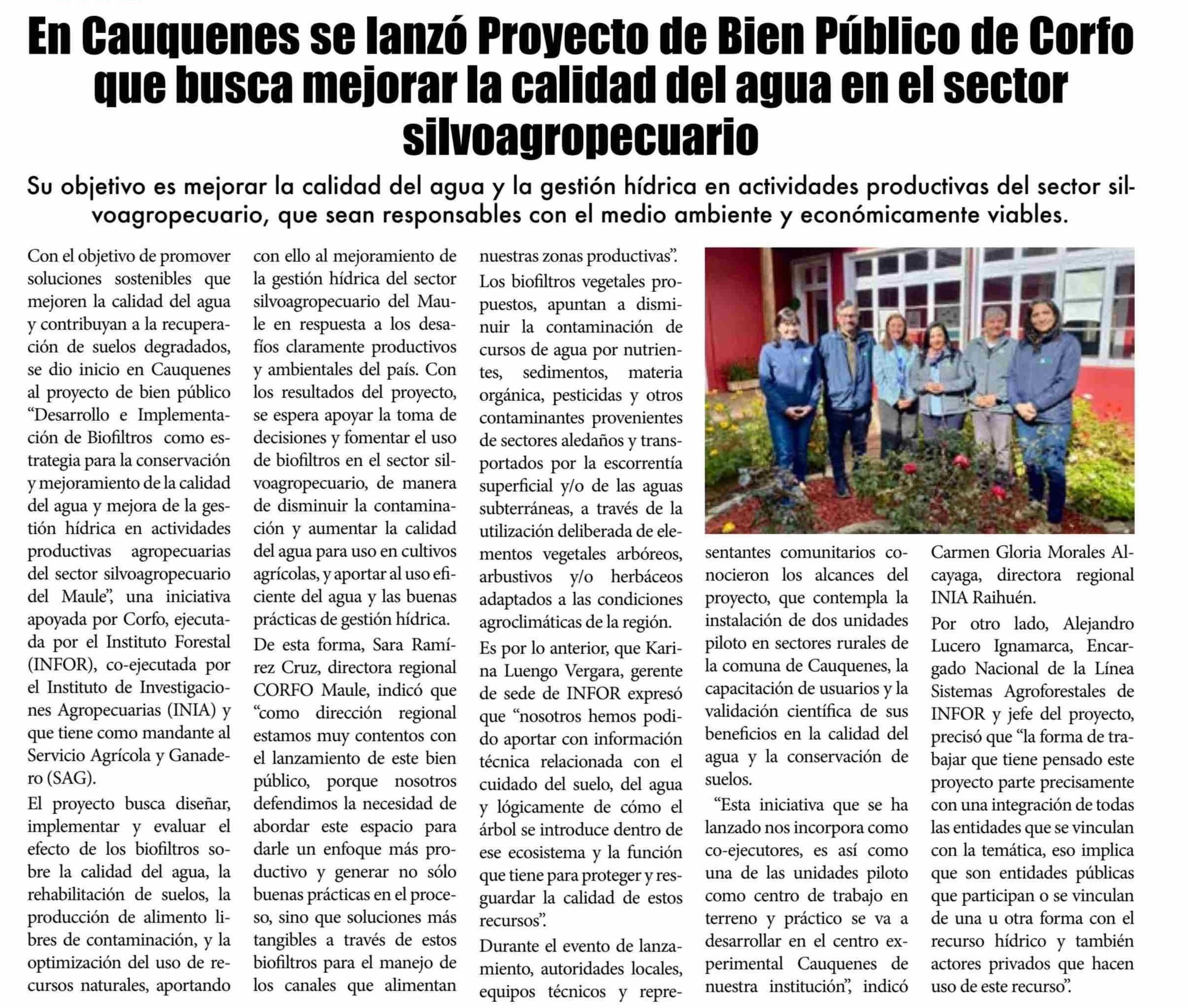 En Cauquenes se lanzó Proyecto de Bien Público de Corfo que busca mejorar la calidad del agua en el sector silvoagropecuario 28-05-2025 El Lector |