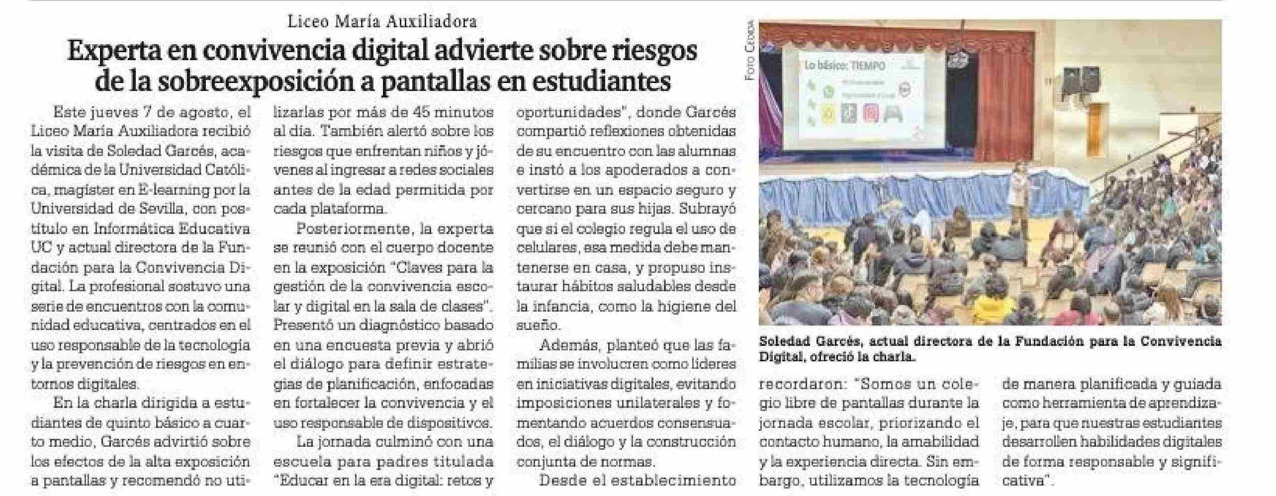 Experta en convivencia digital advierte sobre riesgos de la sobreexposición a pantallas en estudiantes 13-08-2025 La Prensa Austral |