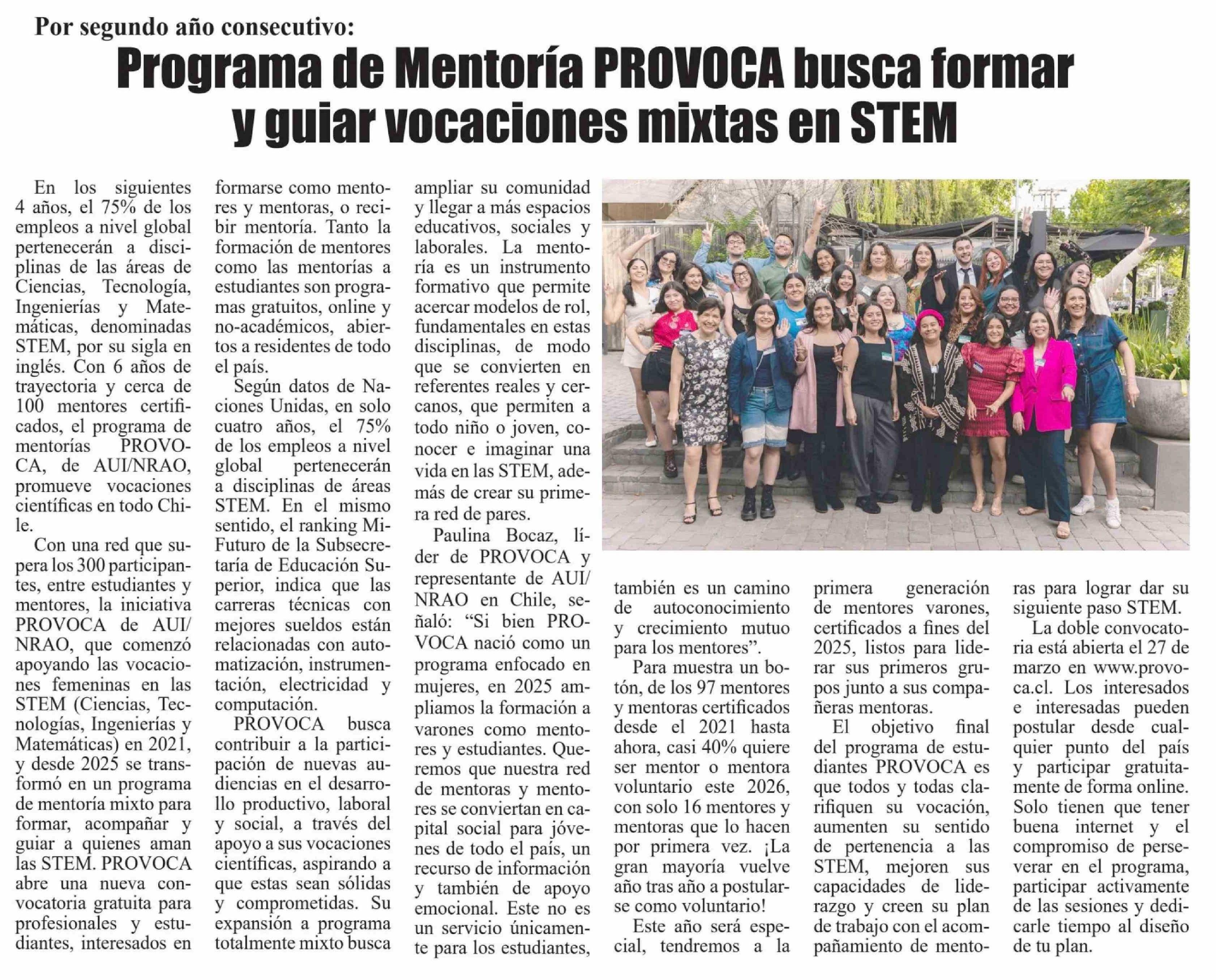 | Título: | Programa de Mentoría PROVOCA busca formar y guiar vocaciones mixtas en STEM |