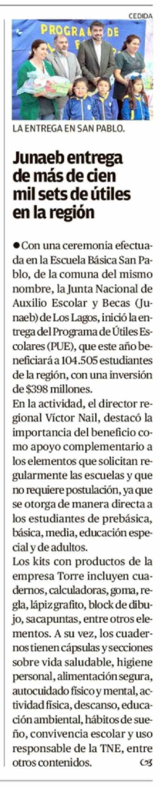 Junaeb entrega de más de cien mil sets de útiles en la región 10-03-2026 El Austral de Osorno |