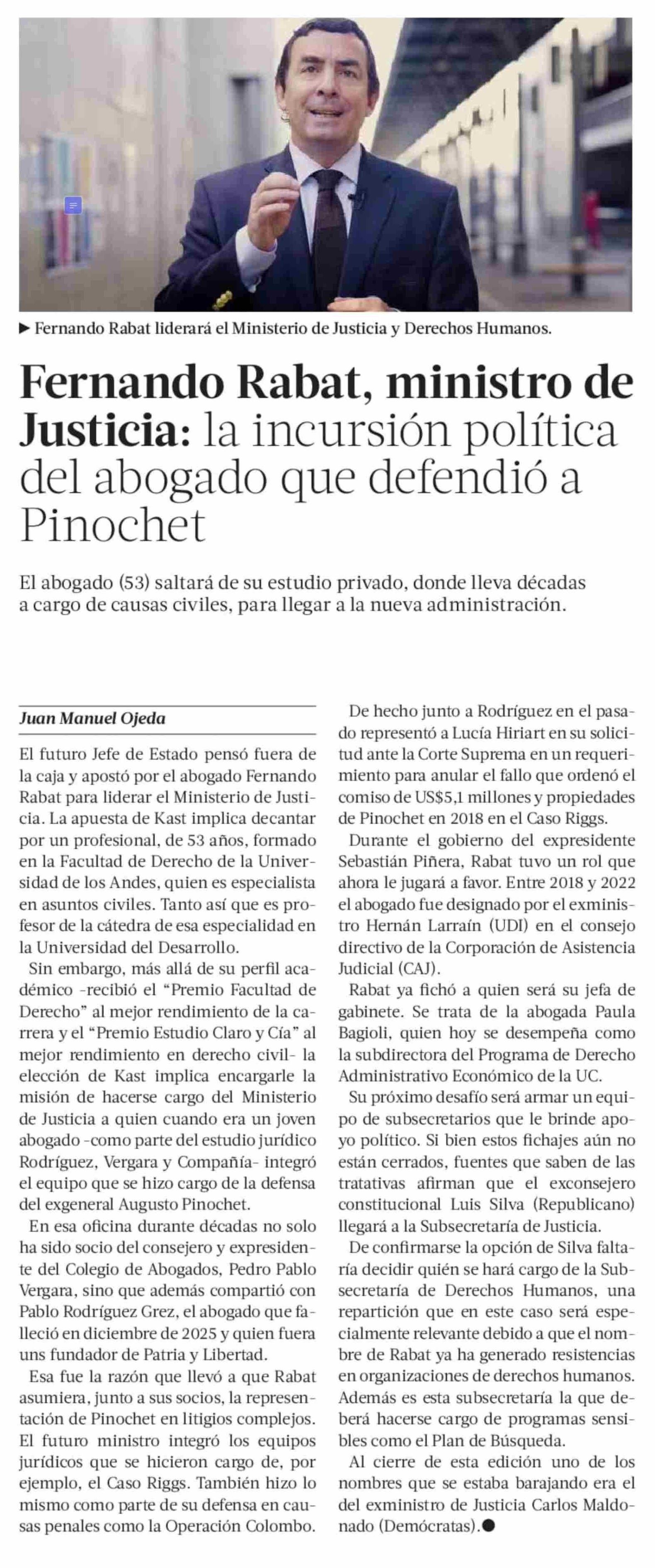 Fernando Rabat, ministro de Justicia: la incursión política del abogado que defendió a Pinochet 21-01-2026 La Tercera |