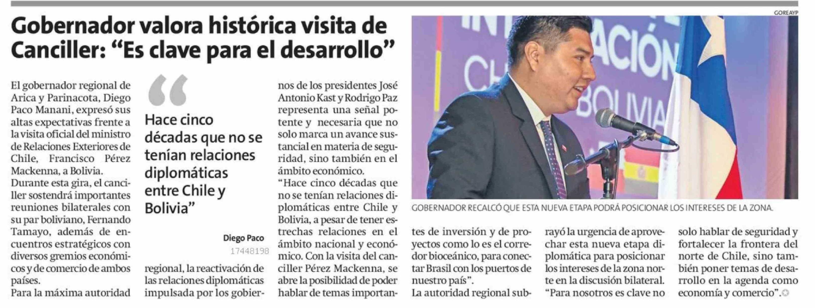 Gobernador valora histórica visita de Canciller: "Es clave para el desarrollo" 24-04-2026 La Estrella de Arica |