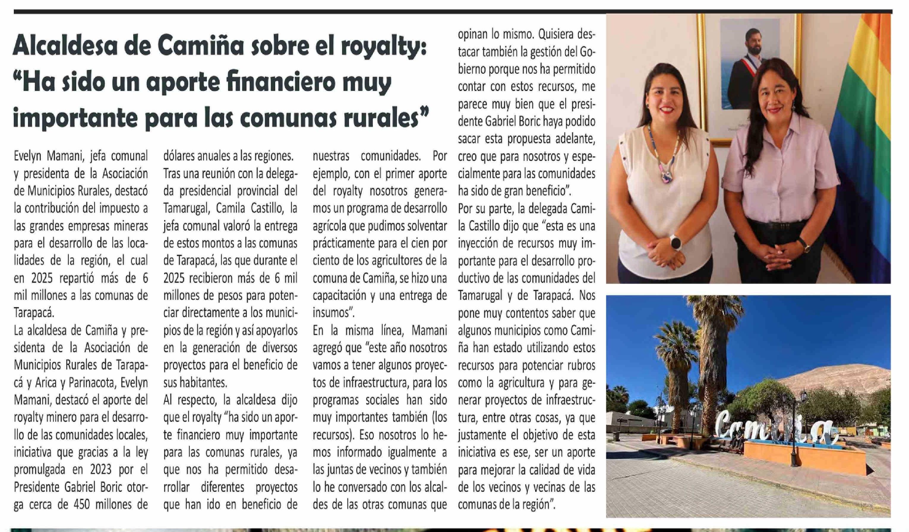 | Título: | Alcaldesa de Camiña sobre el royalty: "Ha sido un aporte financiero muy importante para las comunas rurales" |
