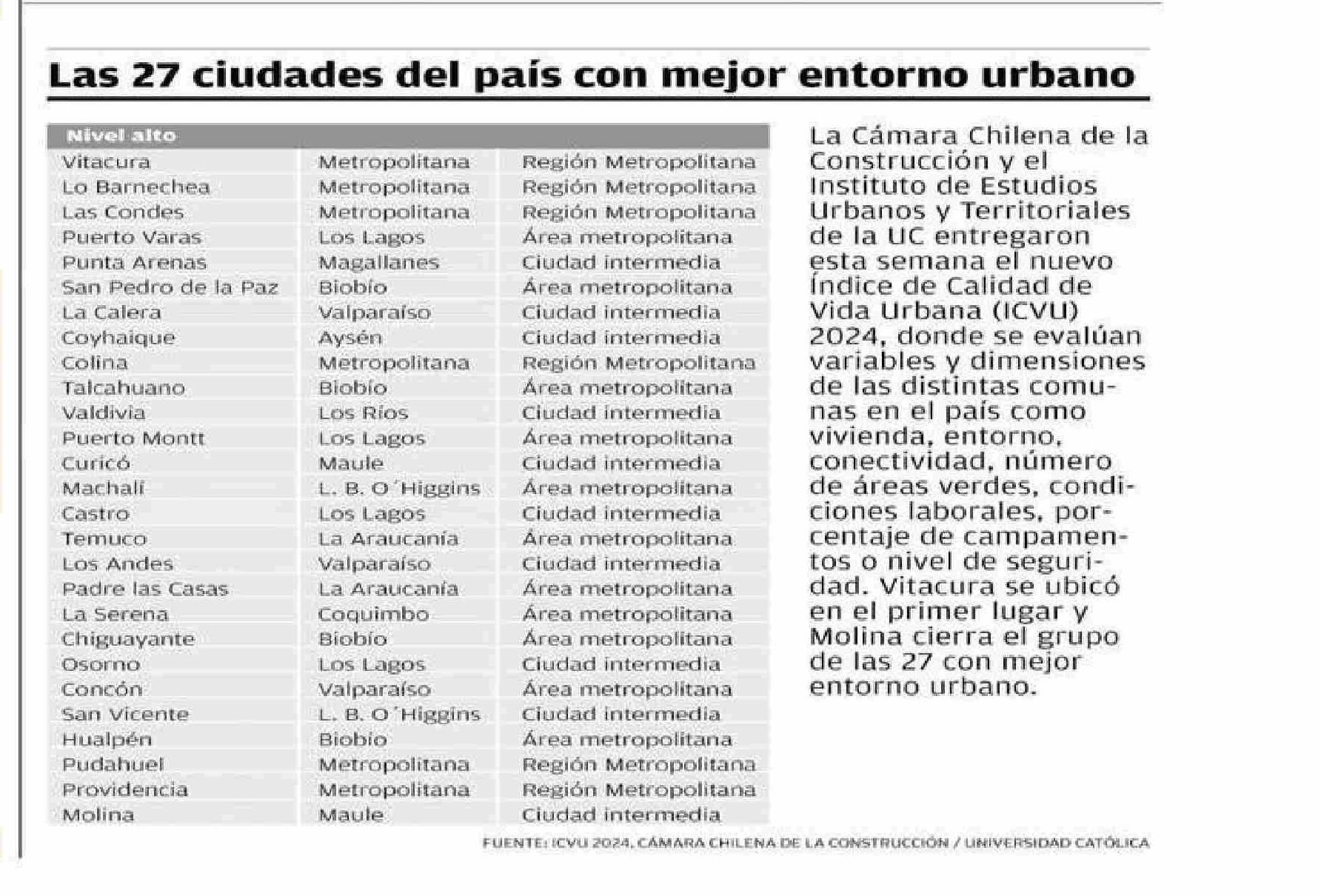 Las 27 ciudades del país con mejor entorno urbano 11-05-2025 El Austral de la Araucanía |