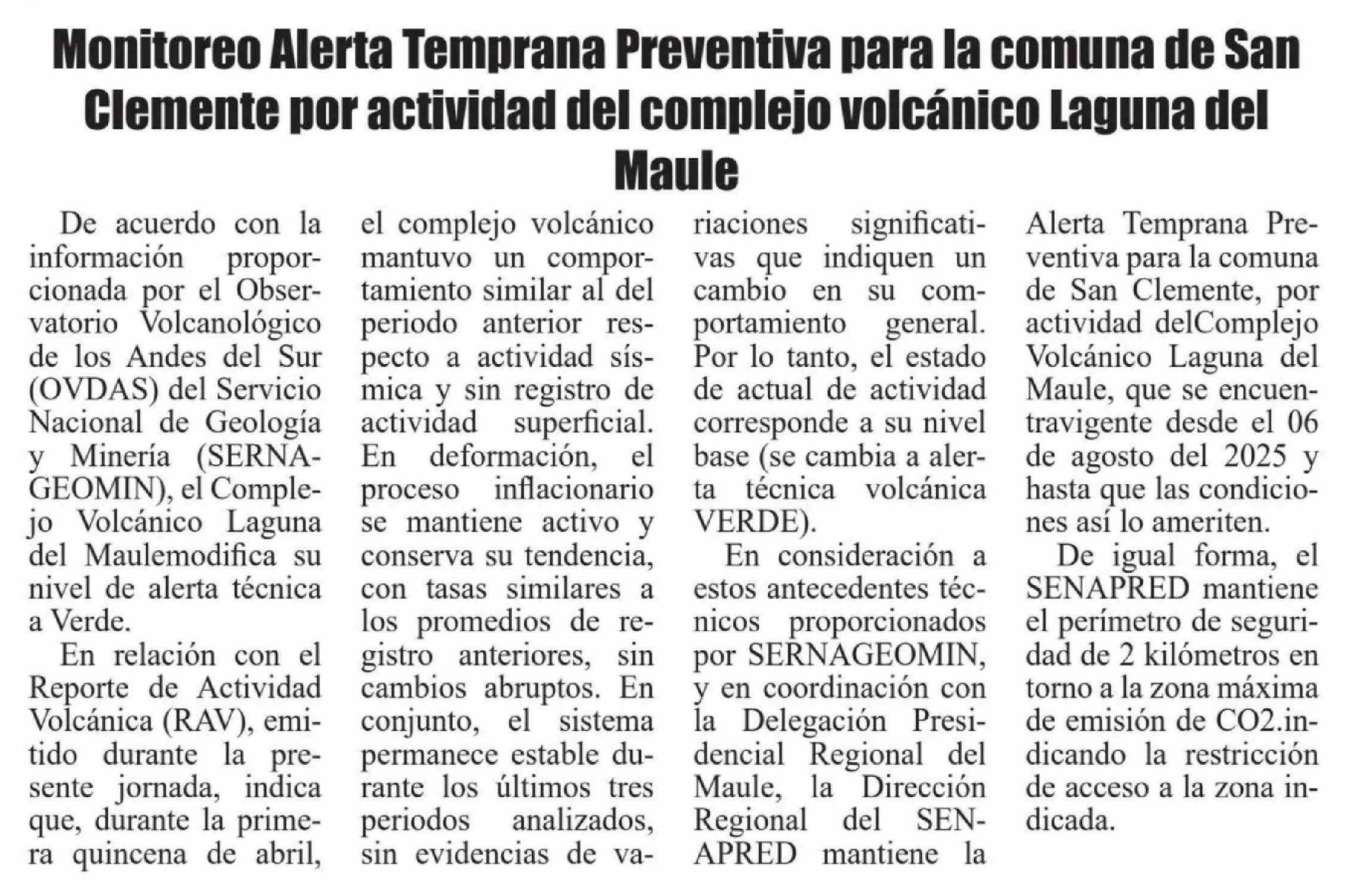 Monitoreo Alerta Temprana Preventiva para la comuna de San Clemente por actividad del complejo volcánico Laguna del Maule