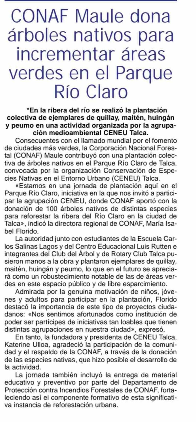 | Título: | CONAF Maule dona árboles nativos para incrementar áreas verdes en el Parque Río Claro |