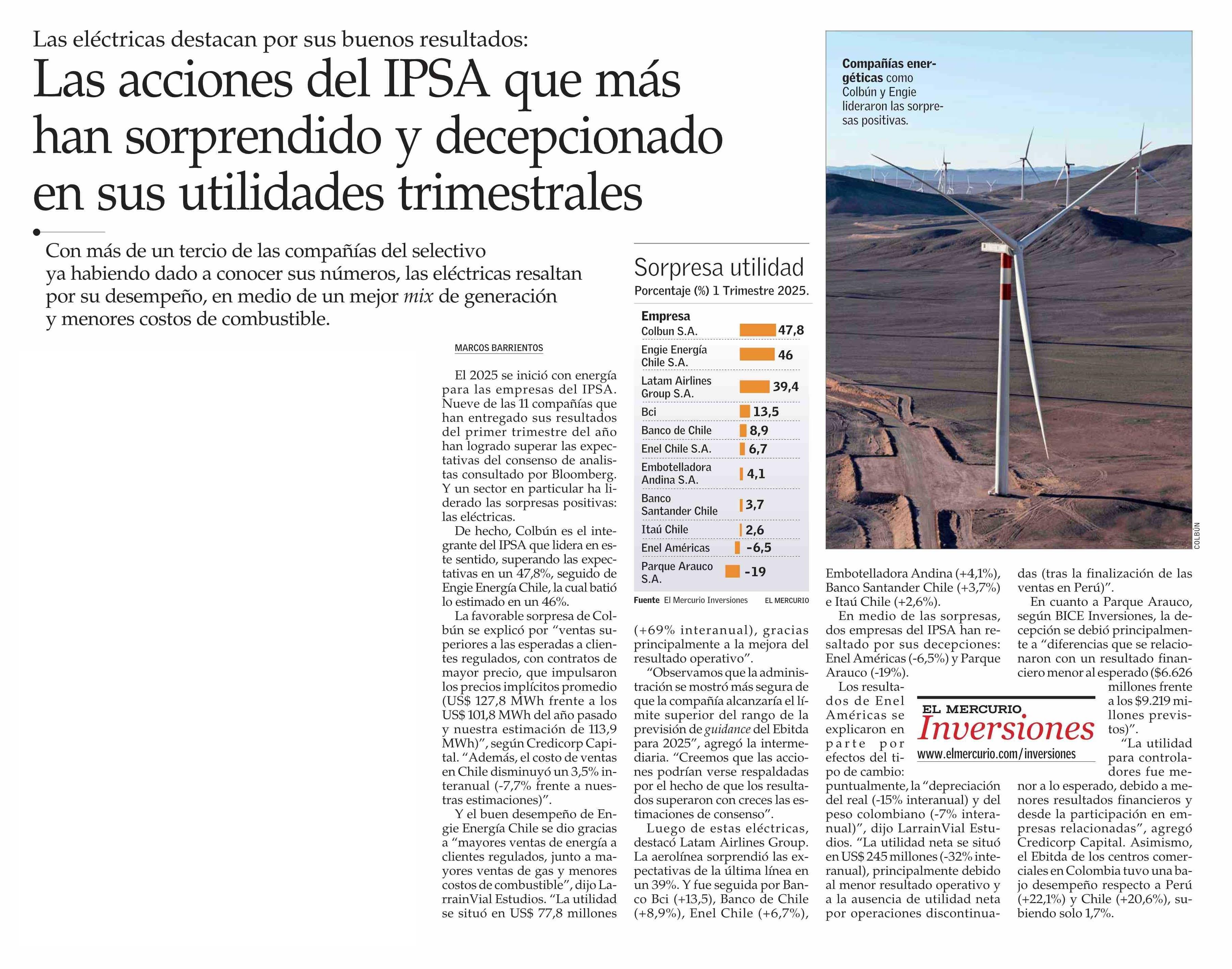 Las acciones del IPSA que más han sorprendido y decepcionado en sus utilidades trimestrales 05-05-2025 El Mercurio |