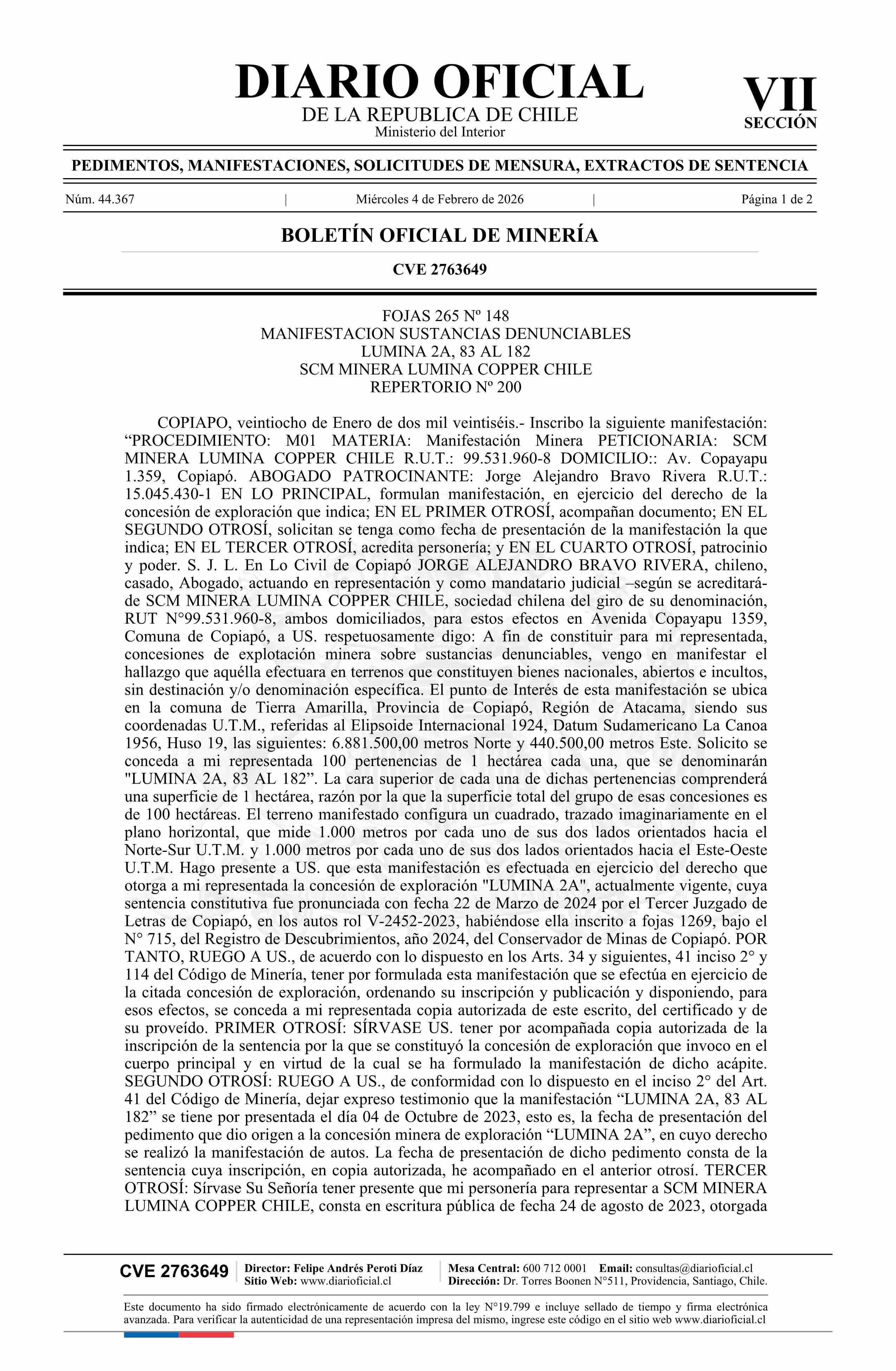 LUMINA 2A, 83 AL 182 / SCM Minera Lumina Copper Chile 04-02-2026 DIARIO OFICIAL CHILE - BOLETÍN OFICIAL DE MINERÍA |