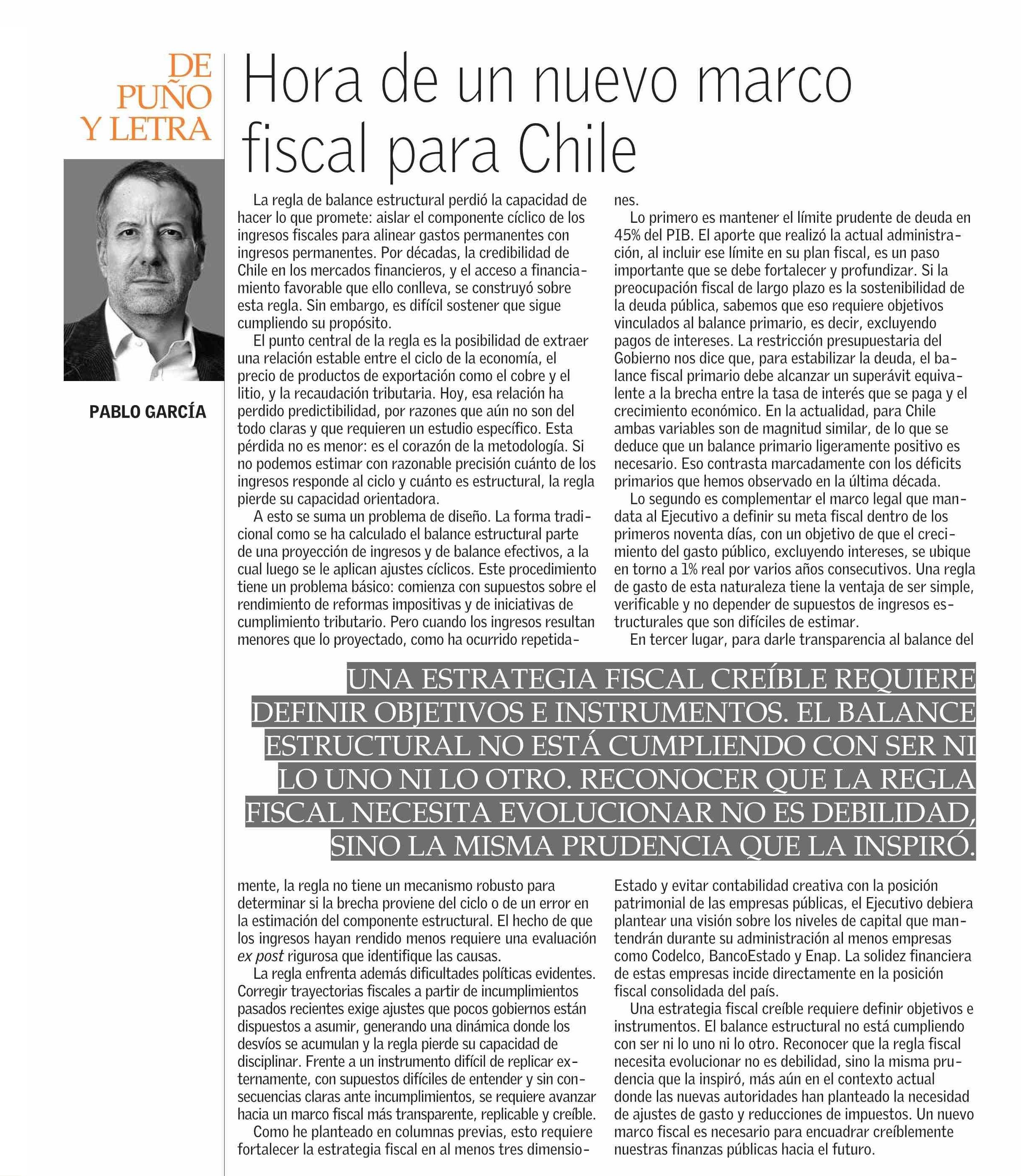 COLUMNAS DE OPINIÓN: Hora de un nuevo marco fiscal para Chile 21-02-2026 El Mercurio |