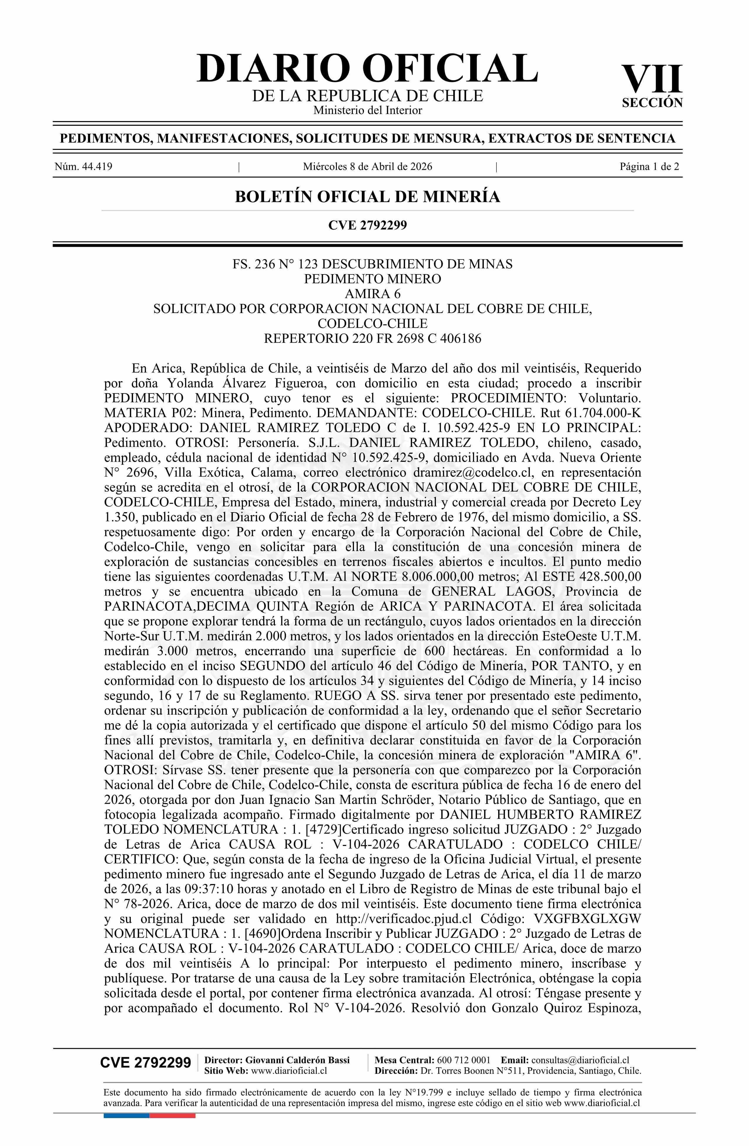 AMIRA 6 / Corporación Nacional del Cobre de Chile 08-04-2026 DIARIO OFICIAL CHILE - BOLETÍN OFICIAL DE MINERÍA |