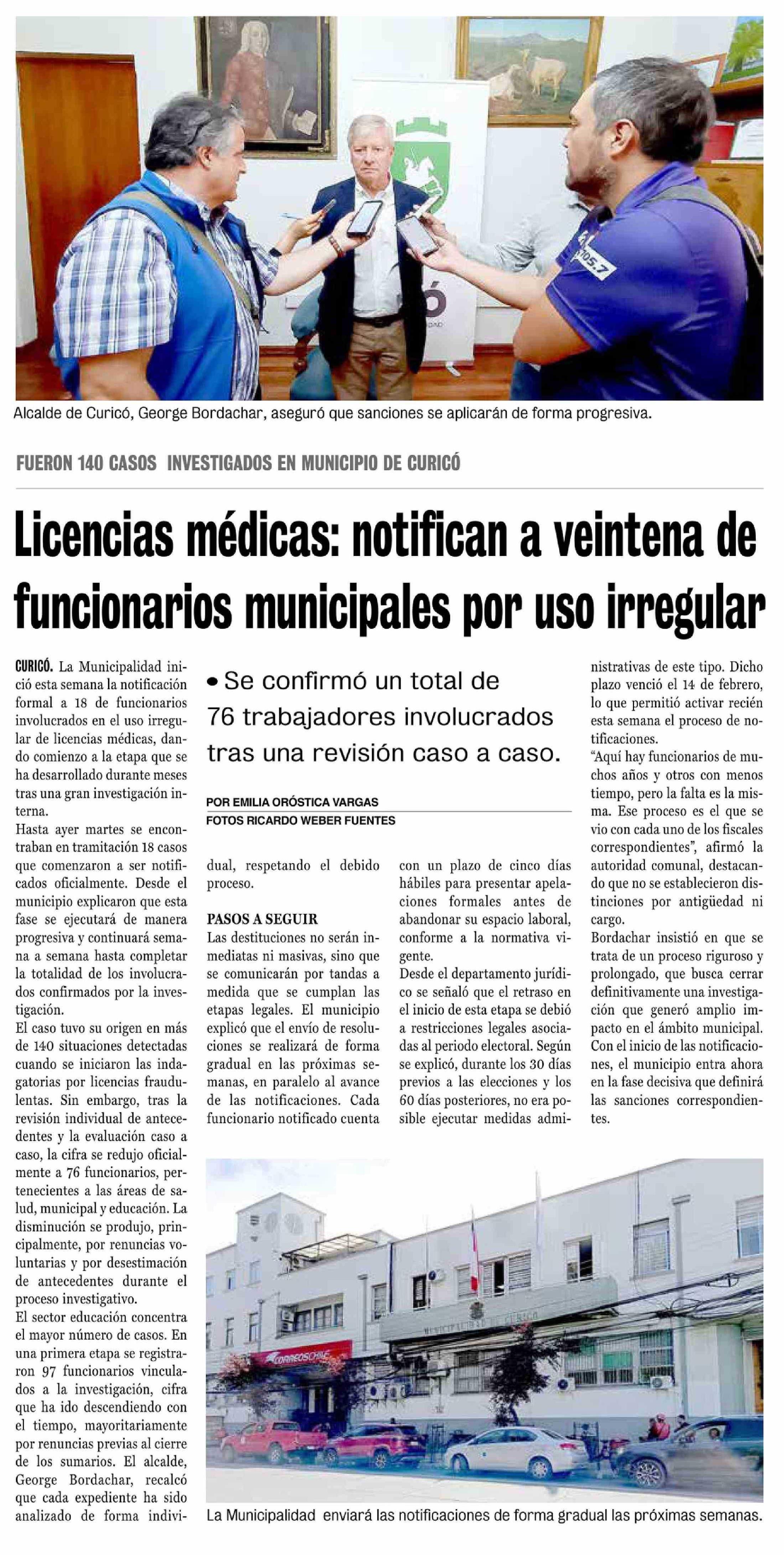 Licencias médicas: notifican a veintena de funcionarios municipales por uso irregular 18-02-2026 La Prensa de Curicó |