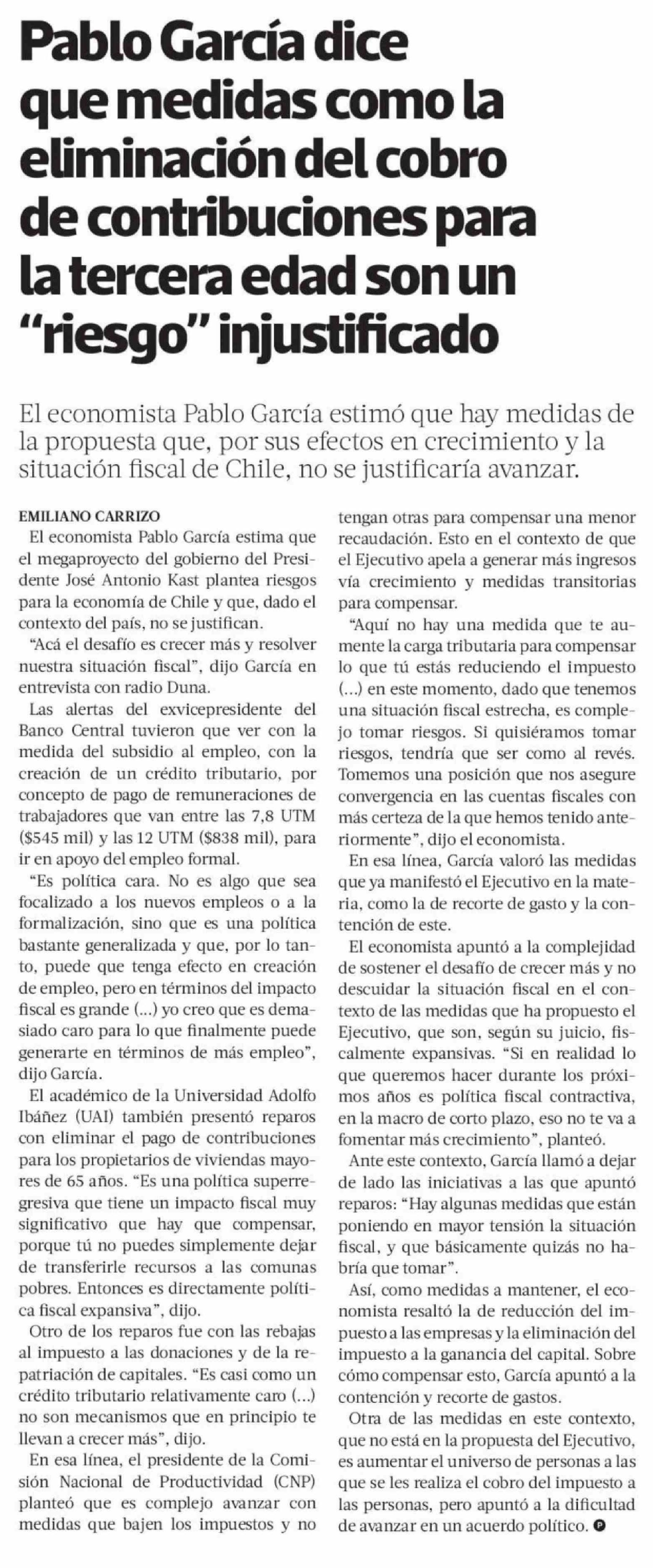 Título: Pablo García dice que medidas como la eliminación del cobro de contribuciones para la tercera edad son un "riesgo" injustificado