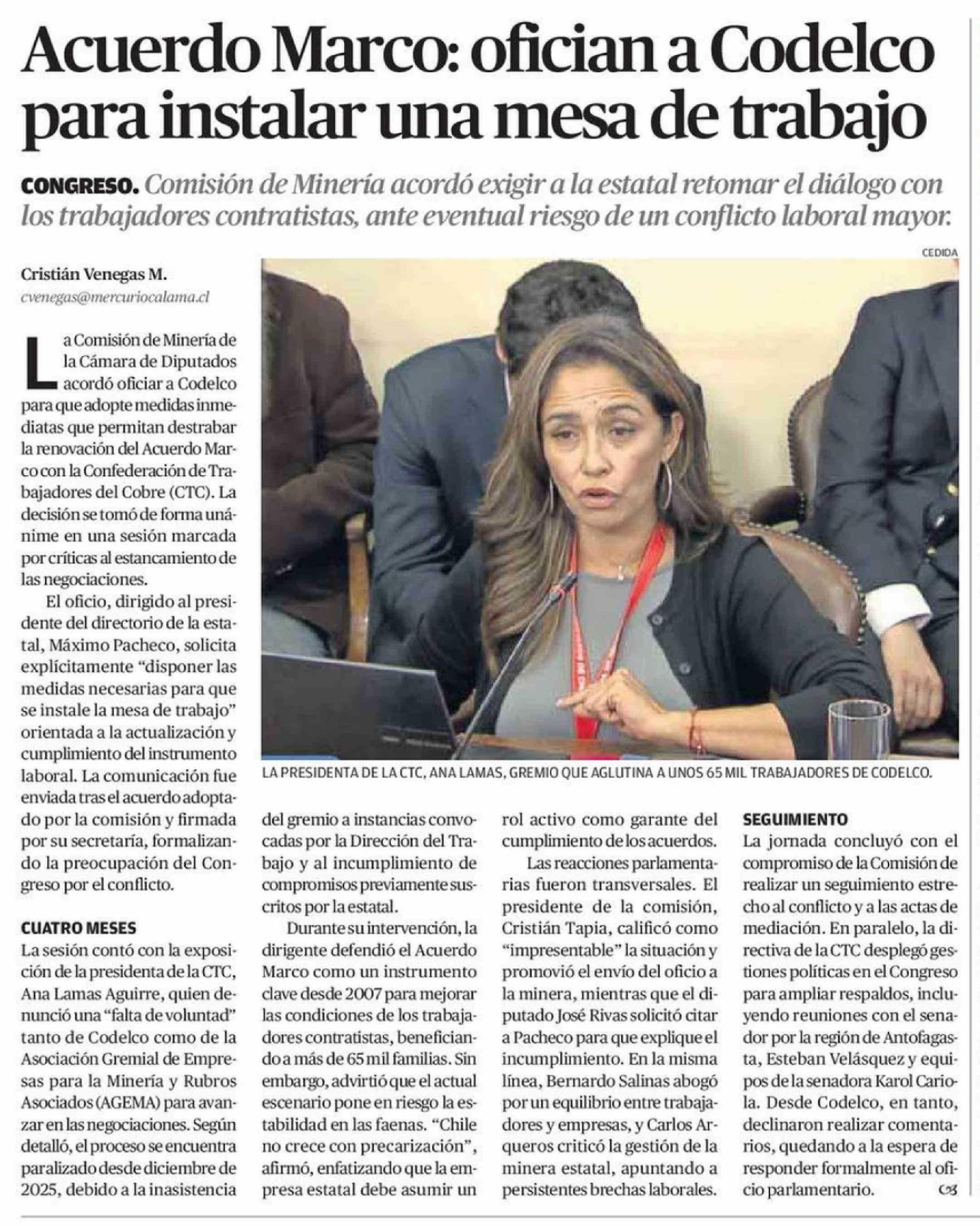 Acuerdo Marco: ofician a Codelco para instalar una mesa de trabajo 10-04-2026 El Mercurio de Calama |