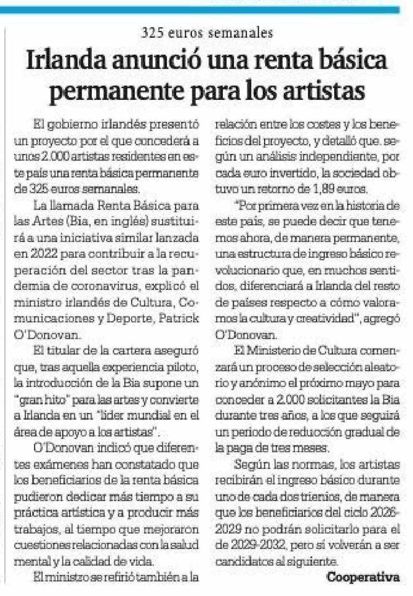 Título: Permanente para los artistas El gobierno irlandés presentó relación entre los costes y los bene un proyecto por el que concederá a ficios del proyecto, y detalló que se-