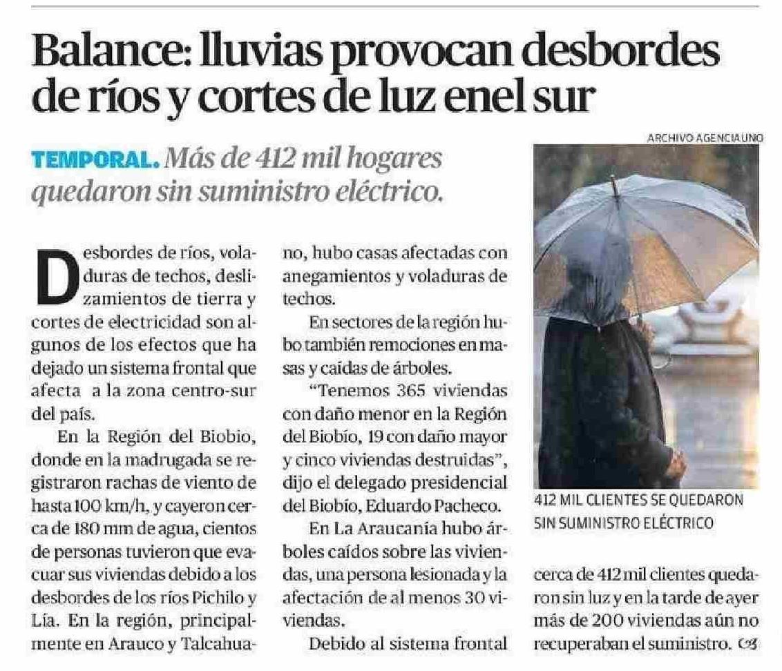 Balance: lluvias provocan desbordes de ríos y cortes de luz enel sur 16-06-2025 El Mercurio de Antofagasta |