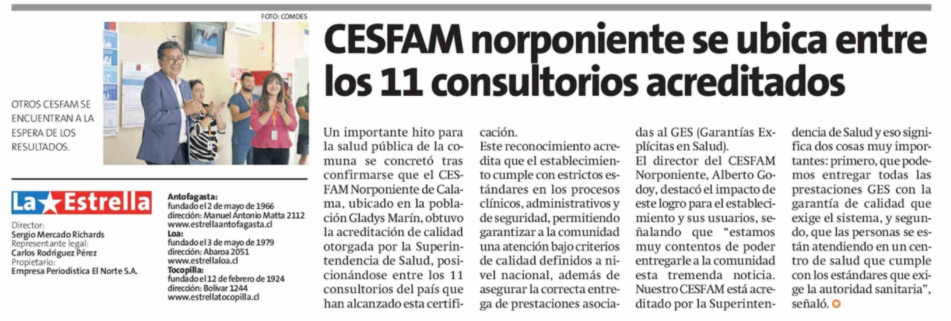 CESFAM norponiente se ubica entre los 11 consultorios acreditados 11-03-2026 La Estrella de Antofagasta |
