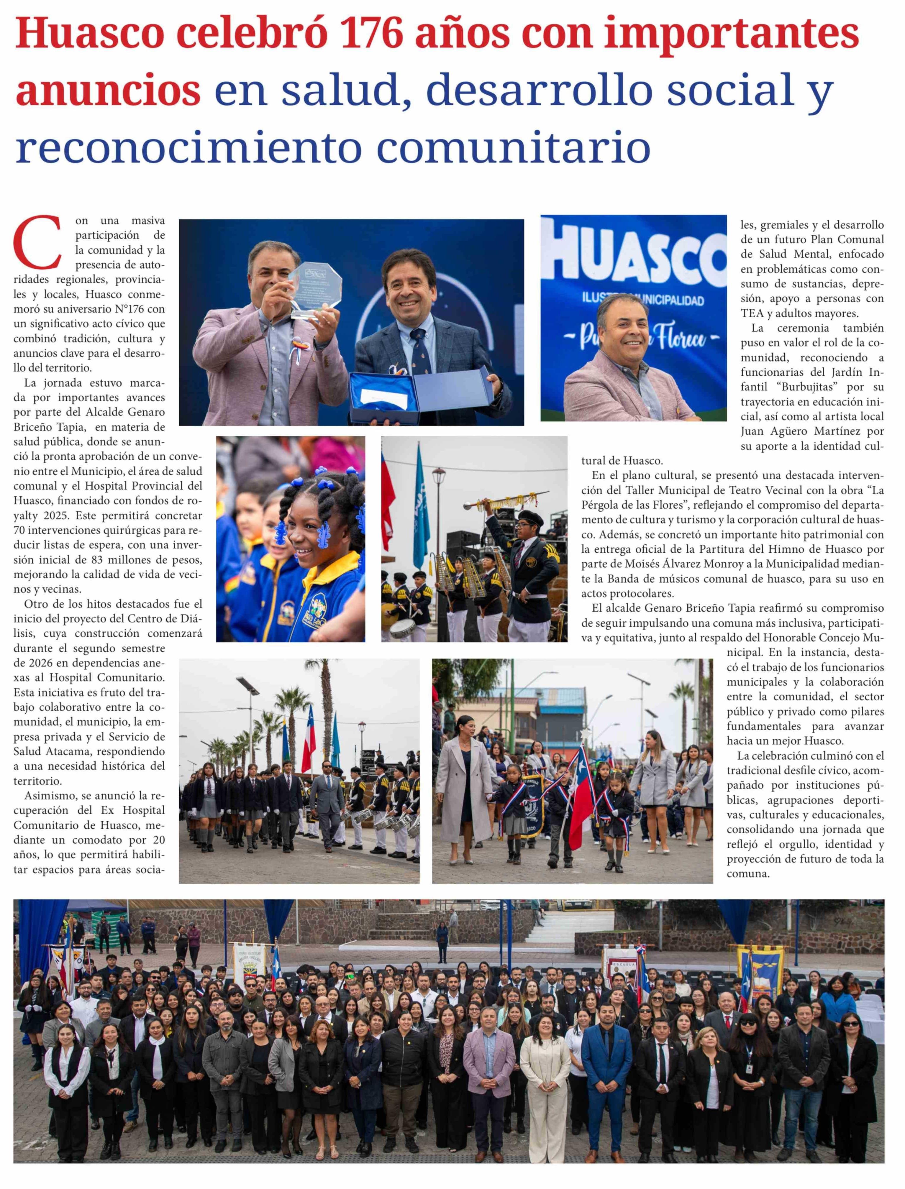 Título: Huasco celebró 176 años con importantes anuncios en salud, desarrollo social y reconocimiento comunitario