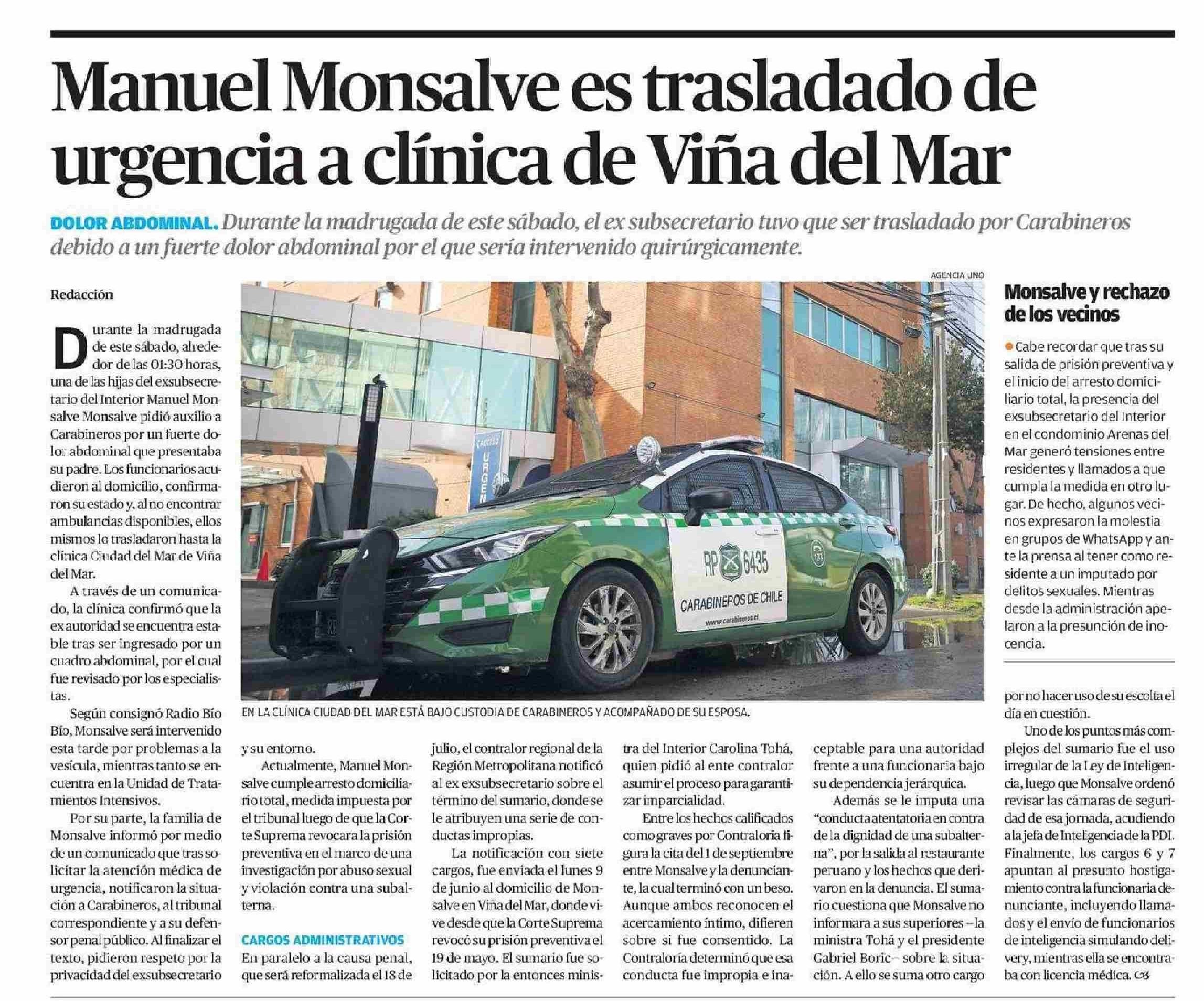 Manuel Monsalve es trasladado de urgencia a clínica de Viña del Mar 15-06-2025 El Diario de Atacama |