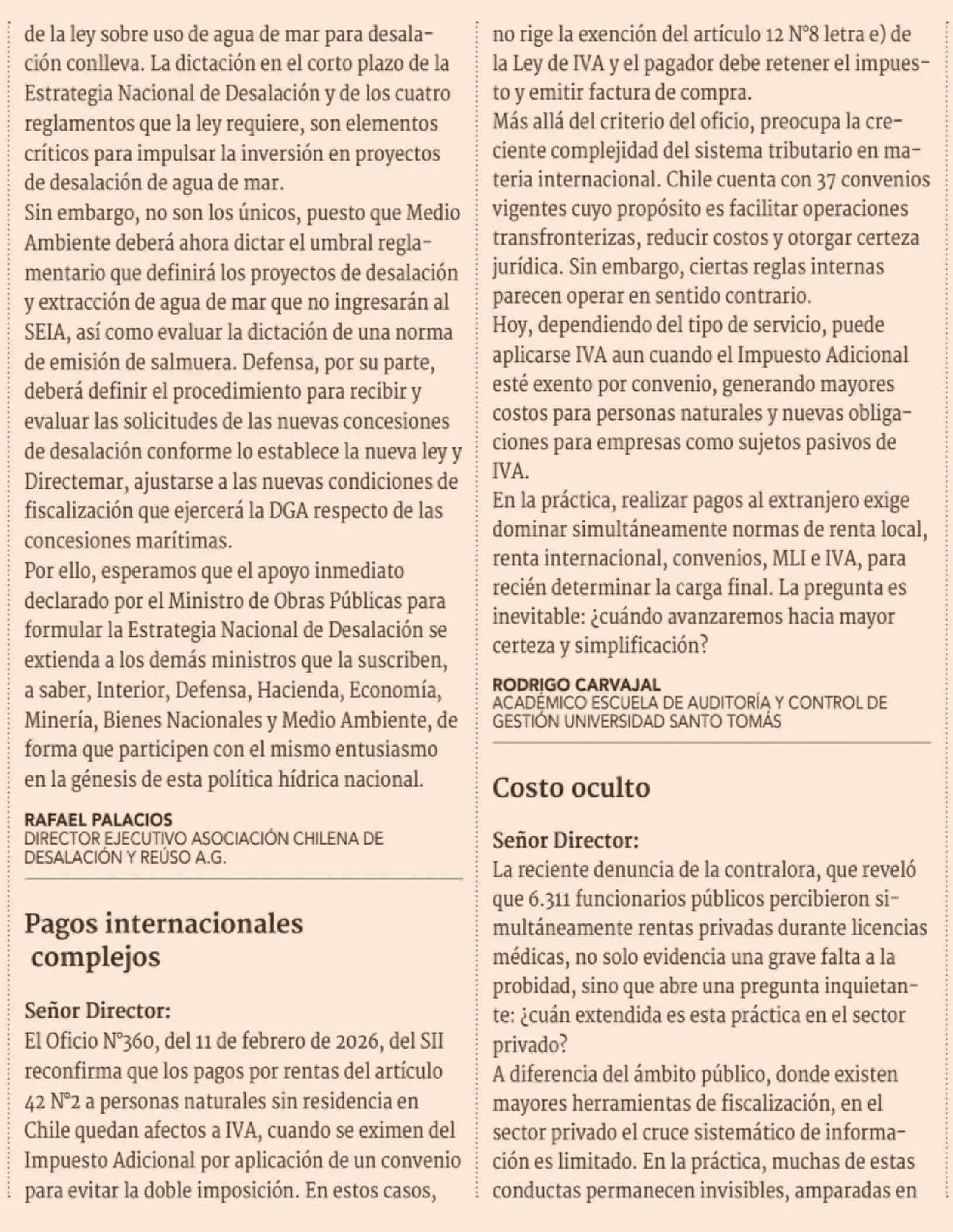 Cartas: Pagos internacionales complejos 01-04-2026 Diario Financiero |