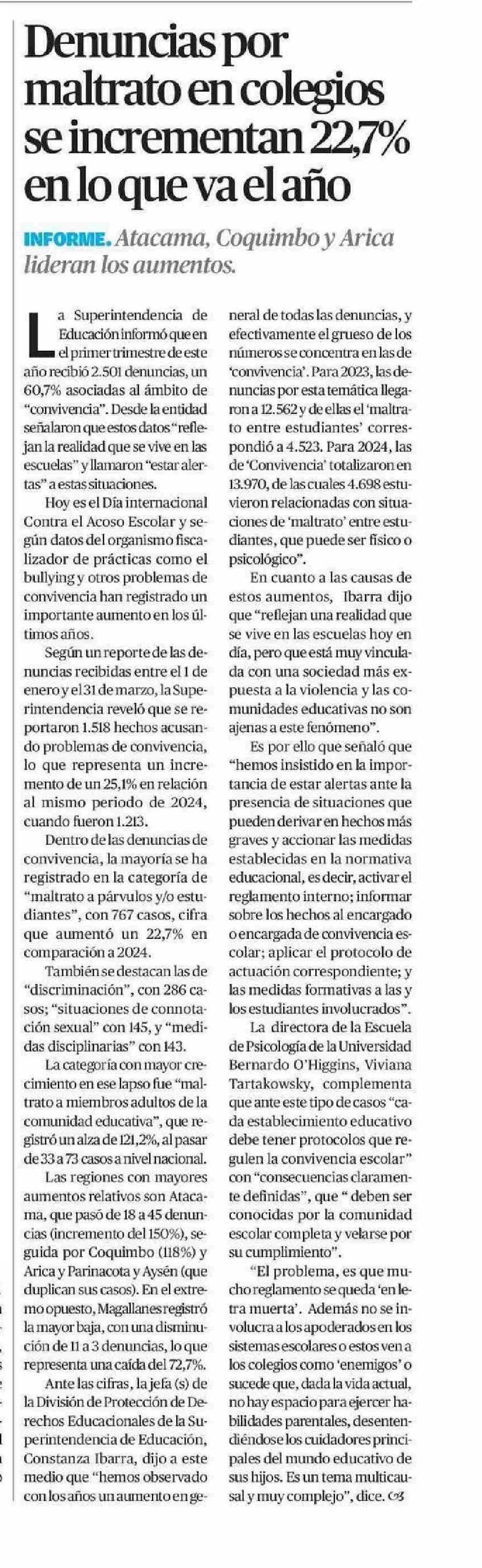 Denuncias por maltrato en colegios se incrementan 22,7% en lo que va el año 02-05-2025 El Diario de Atacama |