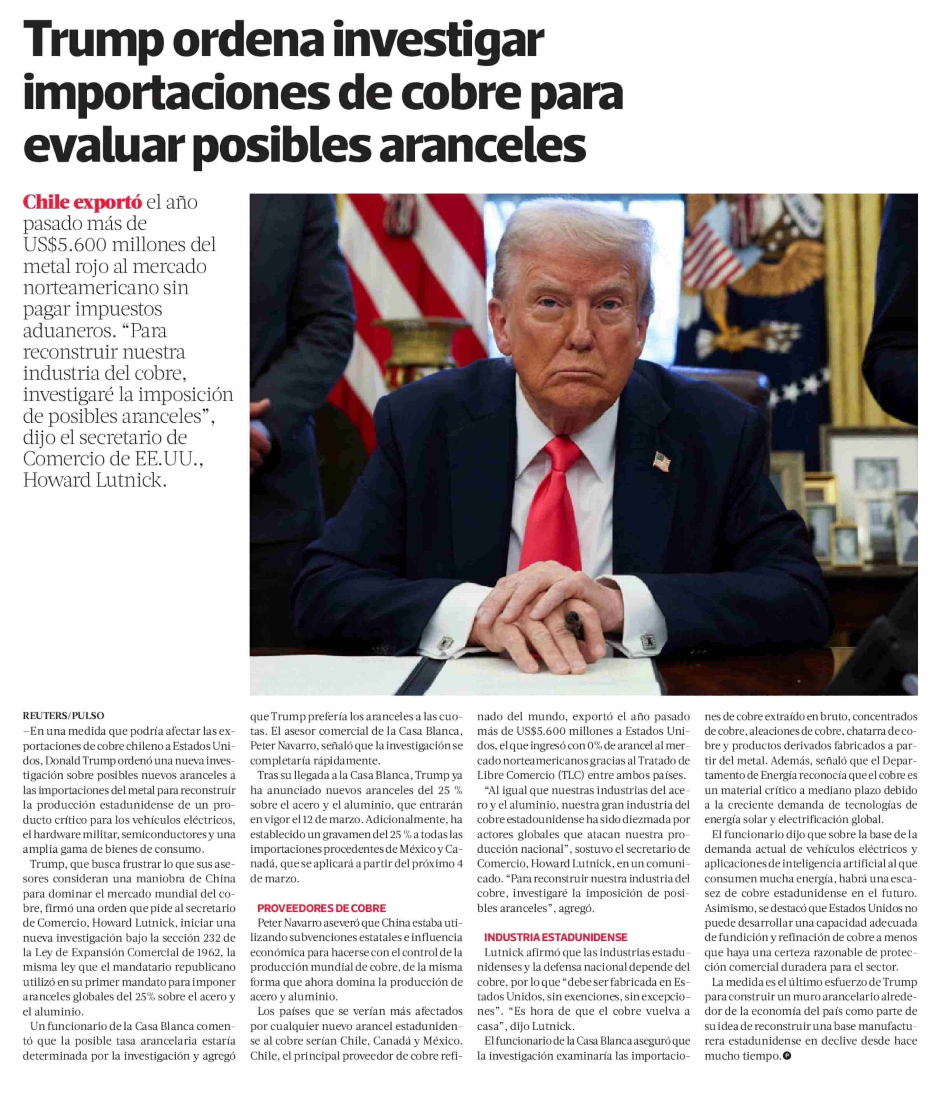 Trump ordena investigar importaciones de cobre para evaluar posibles aranceles 26-02-2025 La Tercera |