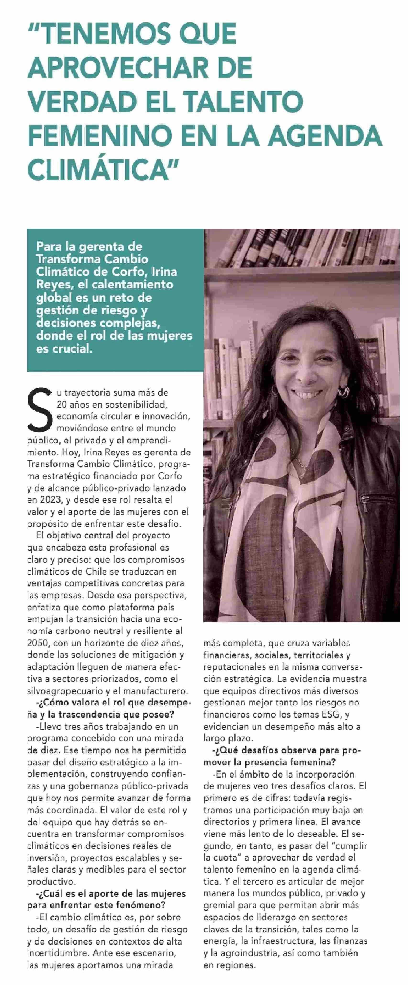 “TENEMOS QUE APROVECHAR DE VERDAD EL TALENTO FEMENINO EN LA AGENDA CLIMÁTICA” 08-03-2026 Diario Financiero |