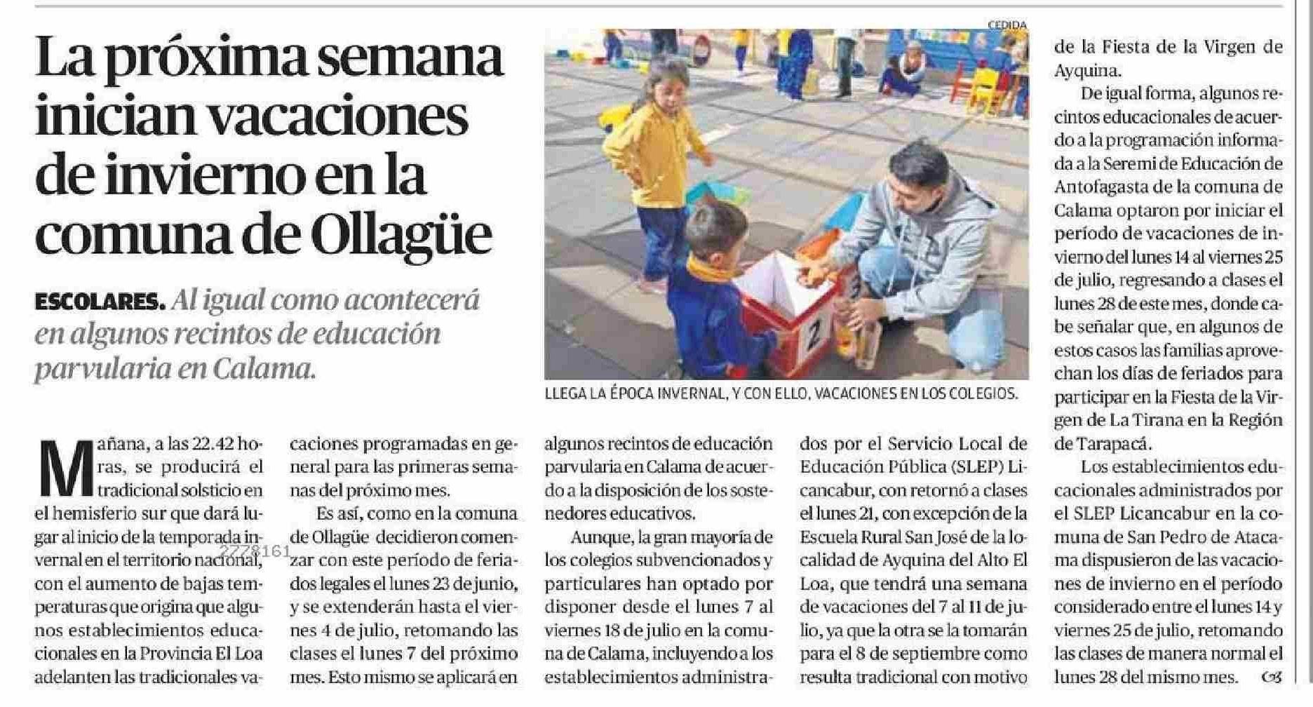 La próxima semana inician vacaciones de invierno en la comuna de Ollagüe 19-06-2025 El Mercurio de Calama |