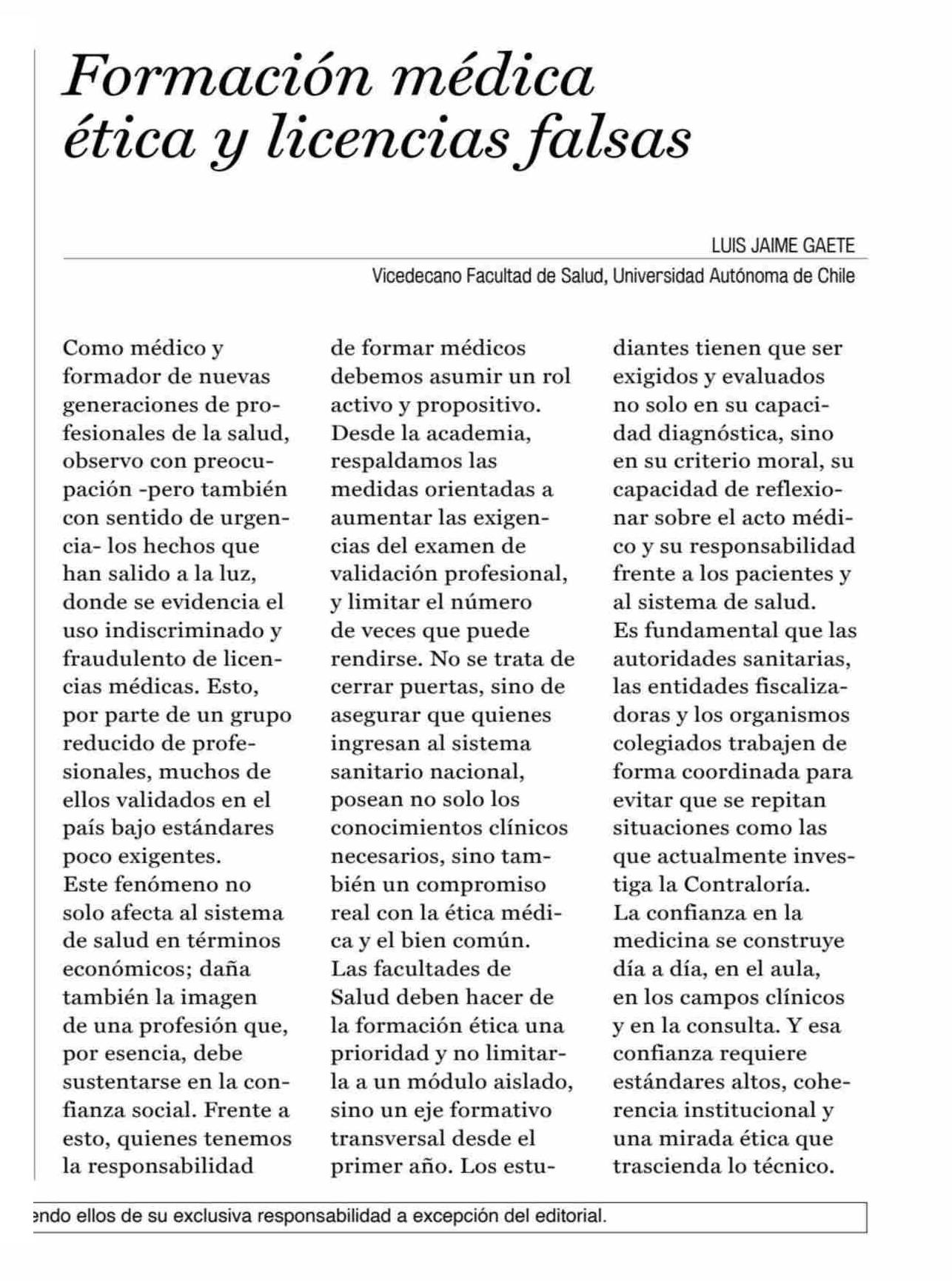 COLUMNAS DE OPINIÓN: Formación médica ética y licencias falsas 10-06-2025 La Prensa de Curicó |