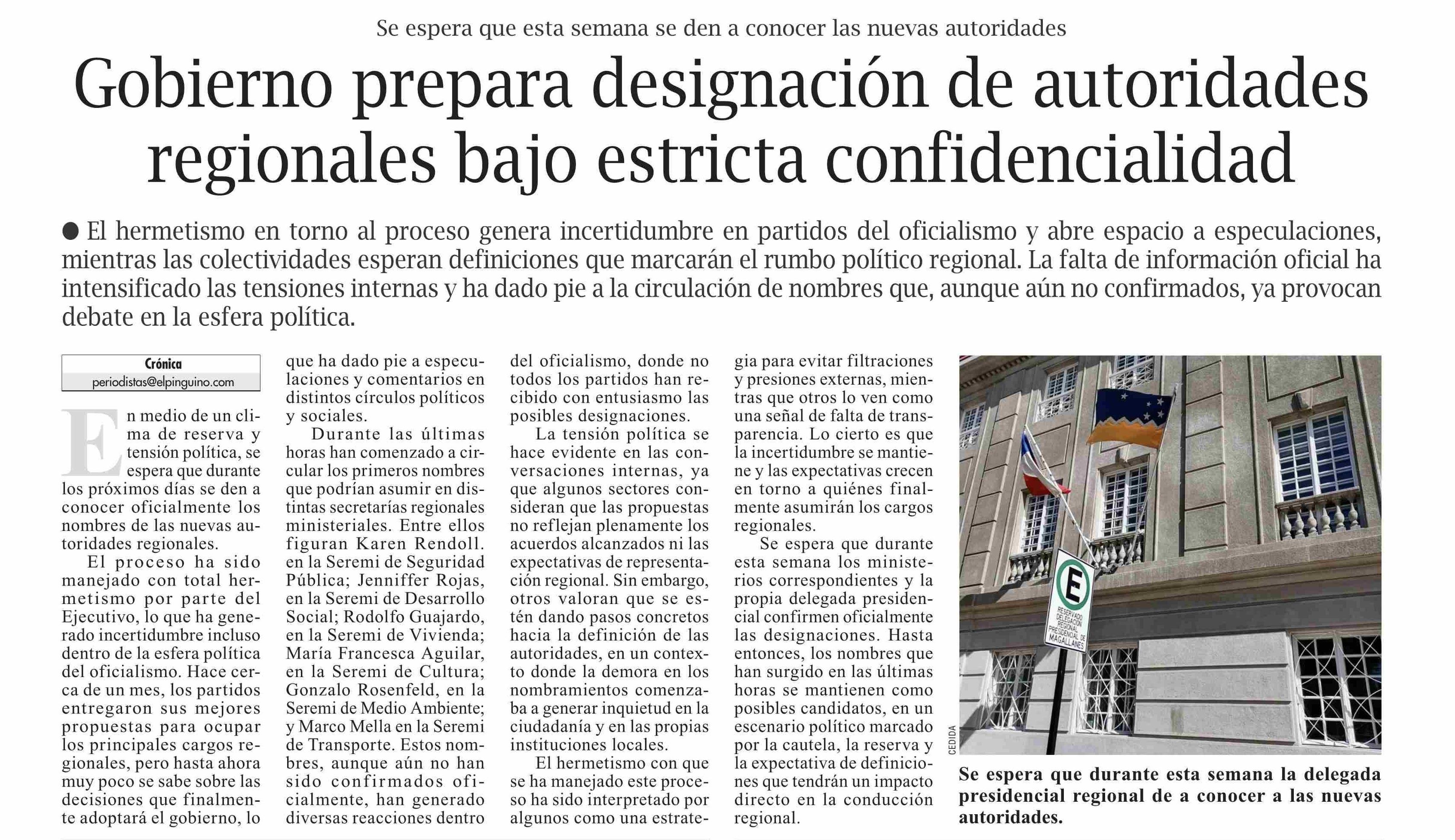 Gobierno prepara designación de autoridades regionales bajo estricta confidencialidad 23-03-2026 El Pingüino |