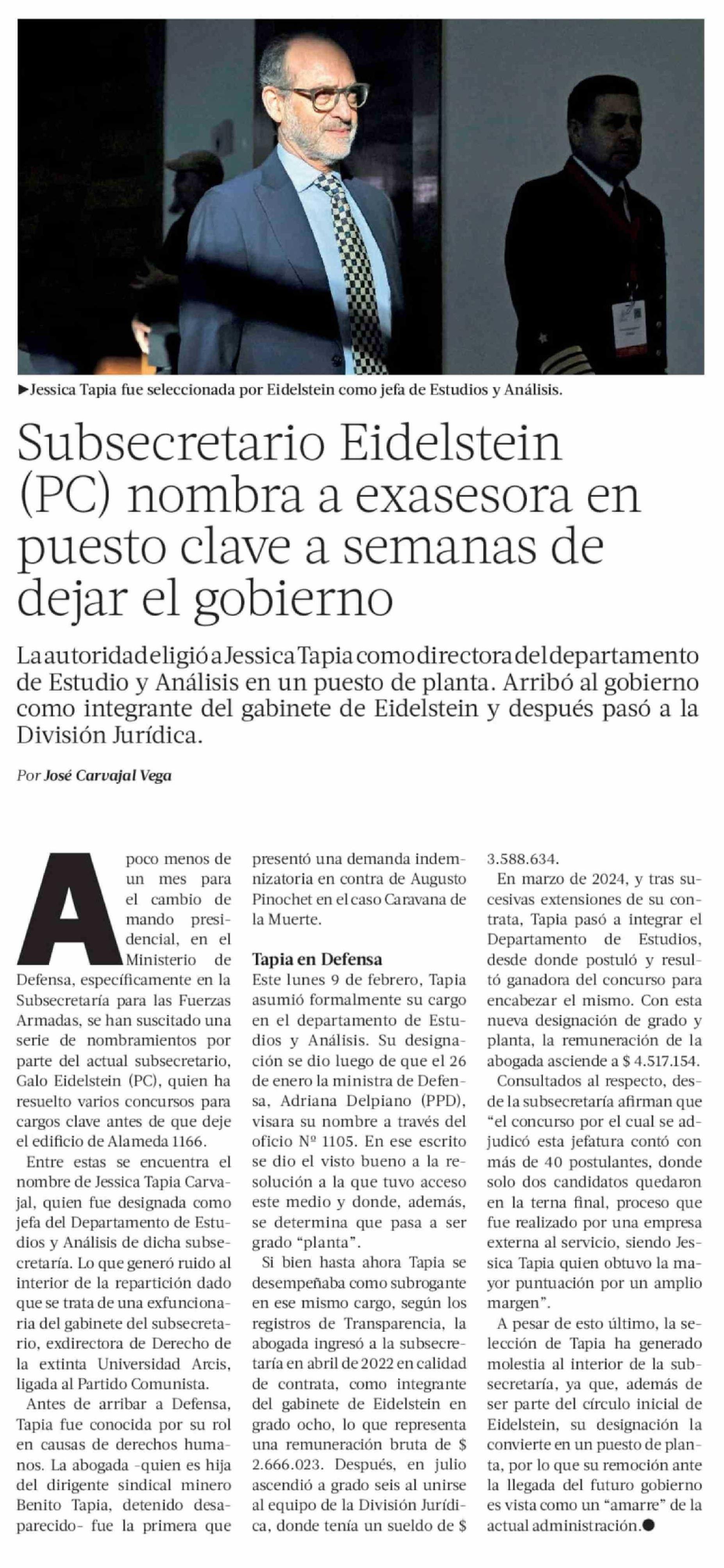 Subsecretario Eidelstein (PC) nombra a exasesora en puesto clave a semanas de dejar el gobierno 14-02-2026 La Tercera |