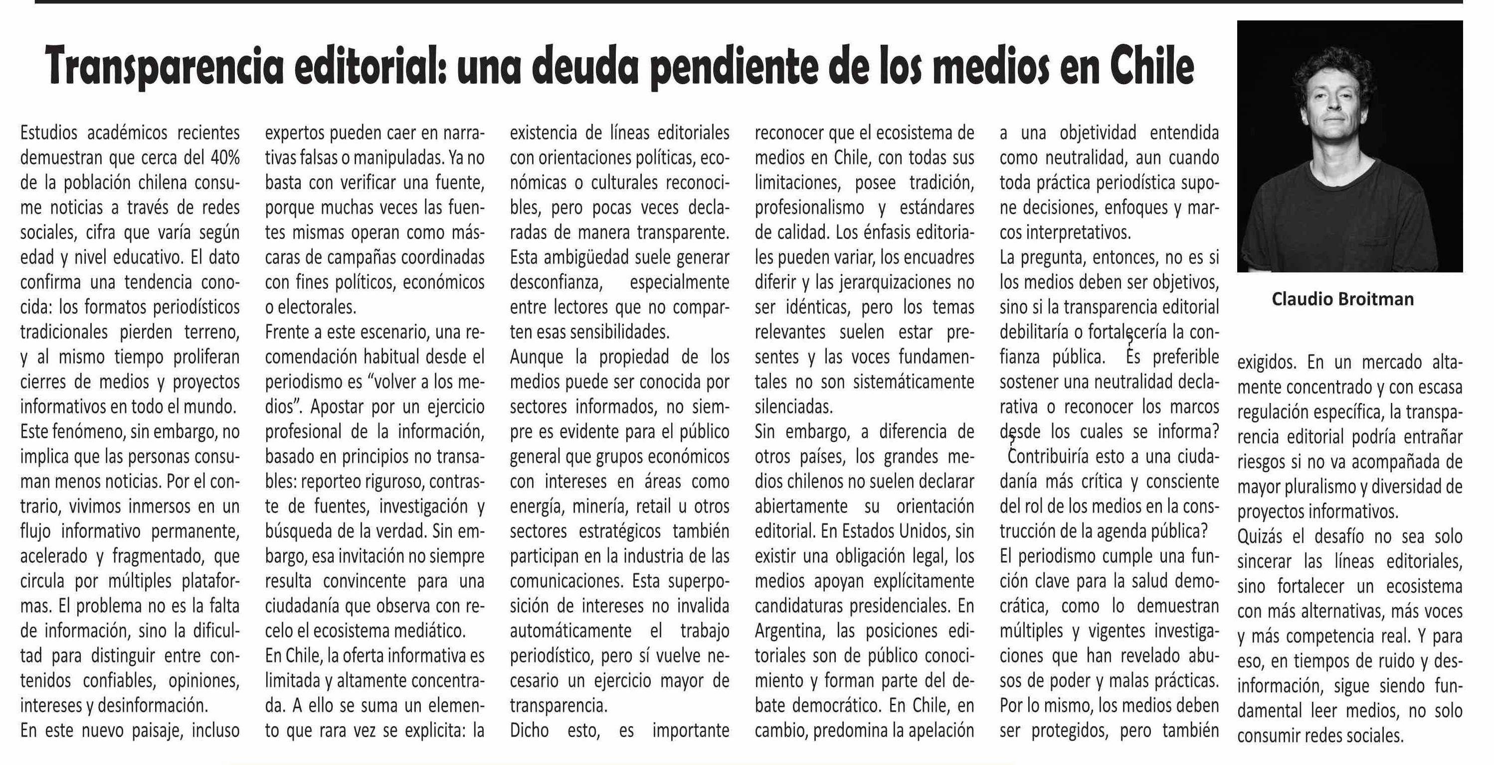 Transparencia editorial: una deuda pendiente de los medios en Chile 22-01-2026 El Longino |
