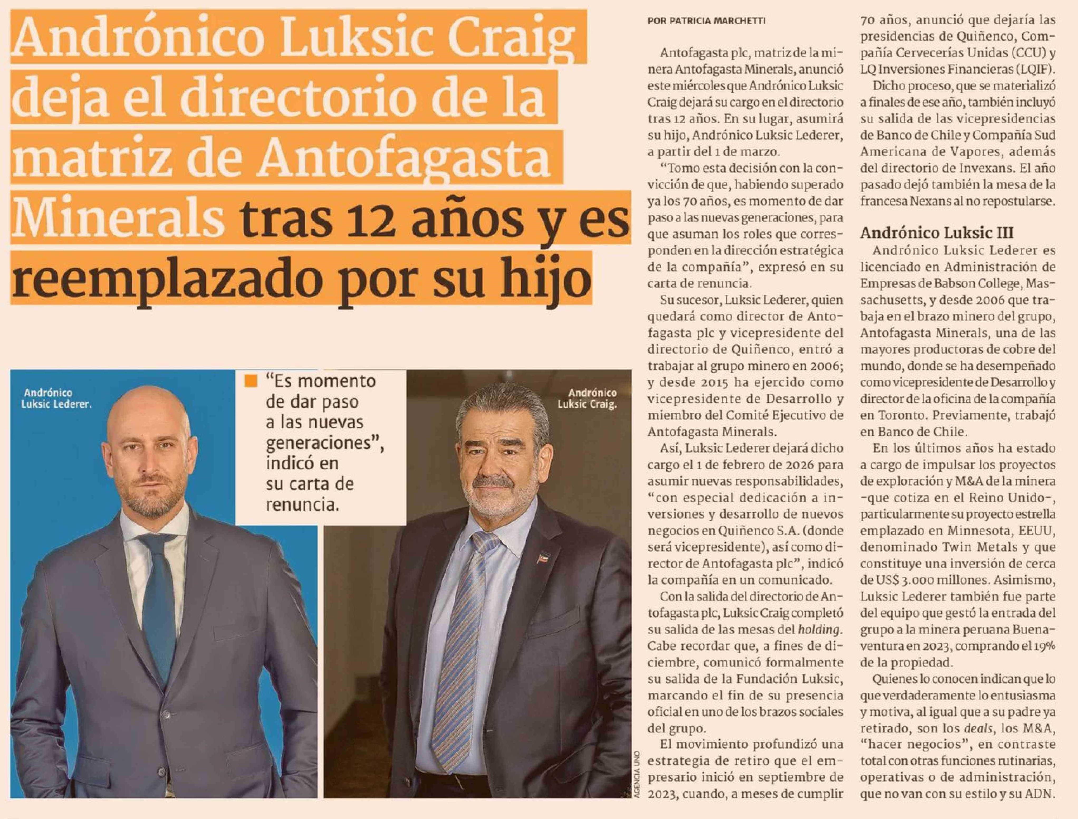 Andrónico Luksic Craig deja el directorio de la matriz de Antofagasta Minerals tras 12 años y es reemplazado por su hijo 29-01-2026 Diario Financiero |