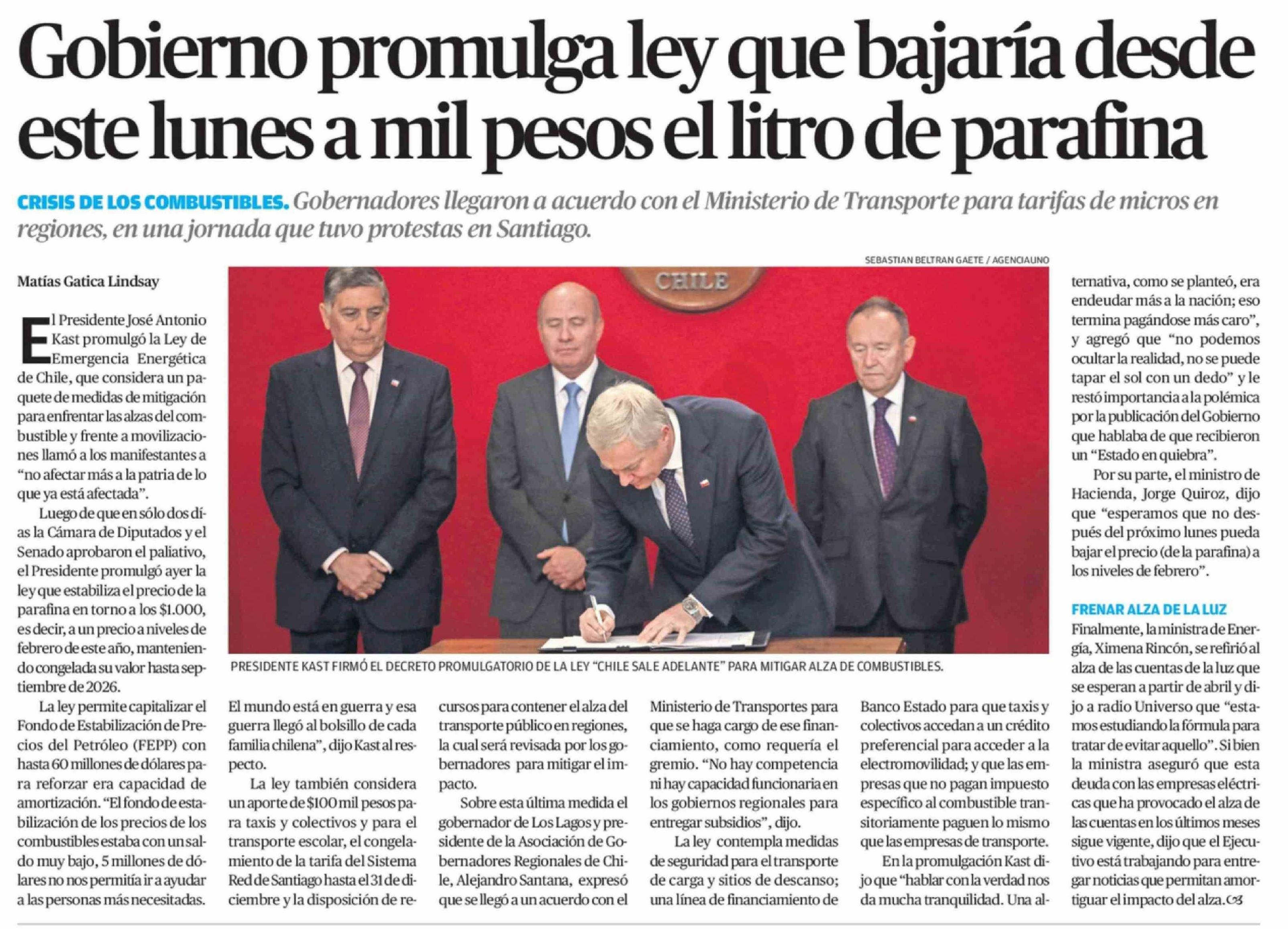 Gobierno promulga ley que bajaría desde este lunes a mil pesos el litro de parafina 27-03-2026 El Mercurio de Antofagasta |